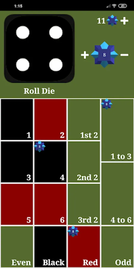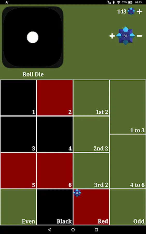 Roll the die, using a roulette style table, with zero house edge, choose red or black, odd or even, high or low, or choose the number. Bet your way with the dice.