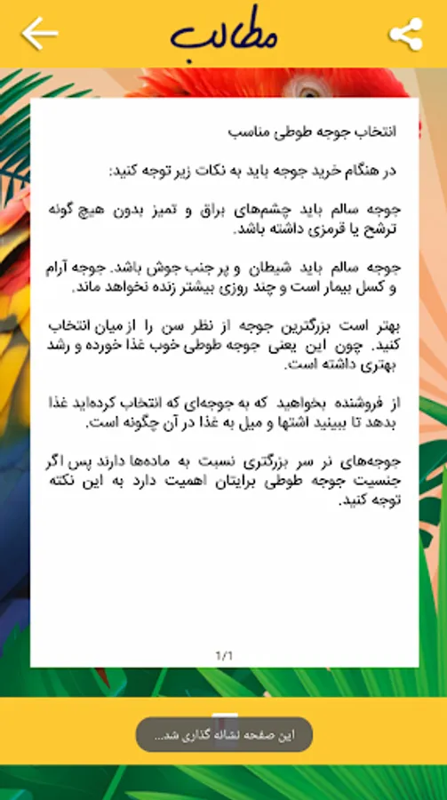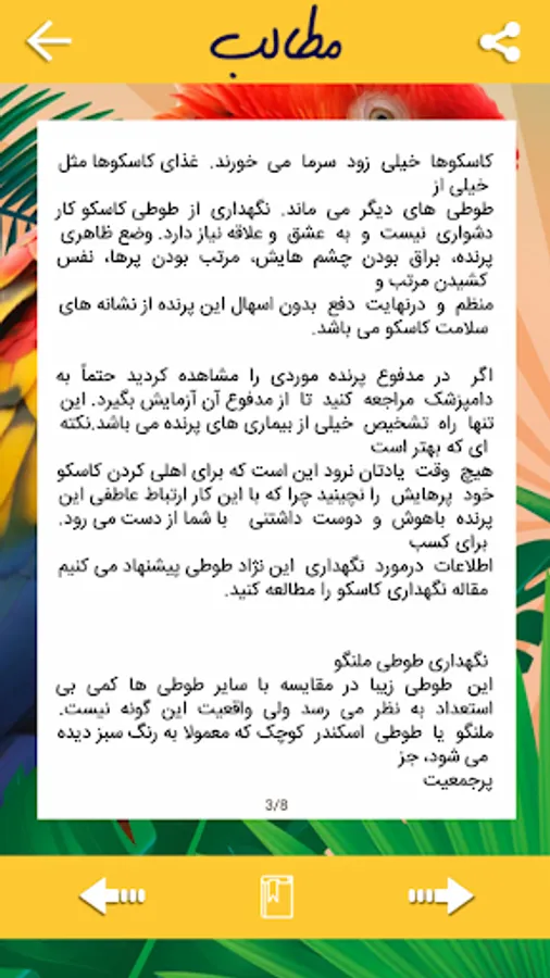 Parrots have a variety of varieties that are distinguished by the various colors of the feathers and the feathers of head and tail. The wings of their colorful and curved parrots are curved and cuckoo, some are short and somewhat short tail and some are long. Parrots have a loud sound. Parrots usually use fruits and seeds and have a very strong beak, used to break hard grains. Most of these birds do not have dual sex, and both sexes are in the same shape. The color of most parrots is green, and this color is combined with other bright colors. Sometimes parrots also have several different colors.