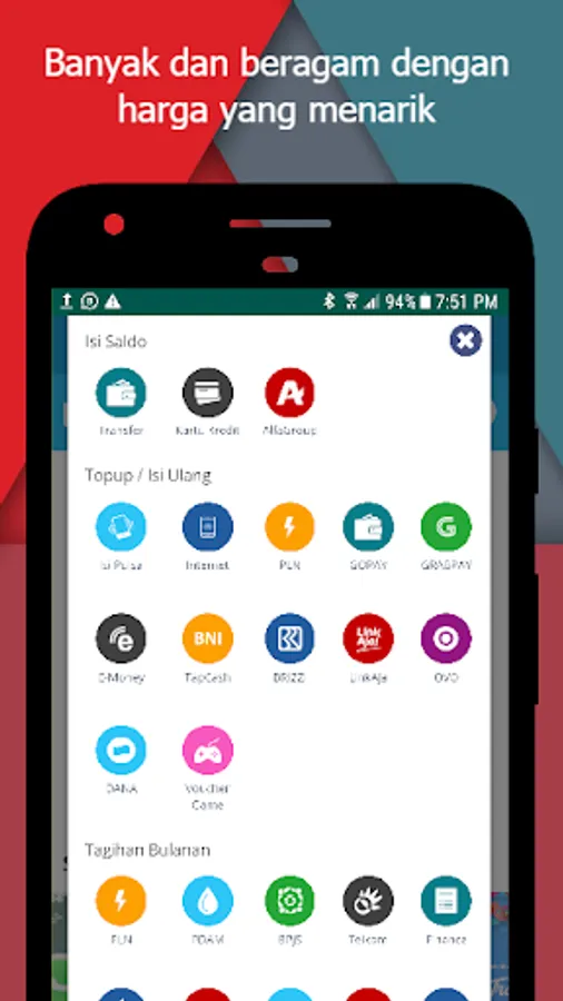 - Topup E-Money, BRIZZI, BNI TapCash, T-CASH, OVO, PAYTREN
