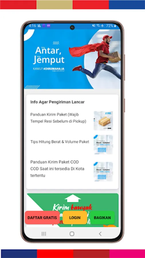 Kemudahan pengiriman paket tanpa harus pergi ke agen ekspedisi. Tinggal Ajukan penjemputan, kurir akan menjemput paket.
