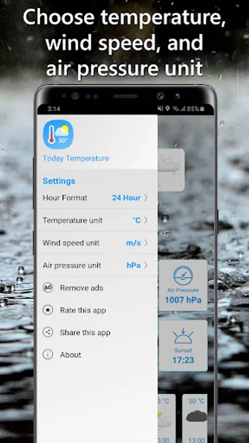 Personalize the app to your preferences with our intuitive settings. Choose between a 24-hour or 12-hour time format, select your preferred temperature unit (Celsius, Fahrenheit, or Kelvin), opt for your desired wind speed unit (m/s, km/h, or mph), and personalize your air pressure unit (hPa, kPa, atm, bar, mBar, Psi, mmHg, or inHg).