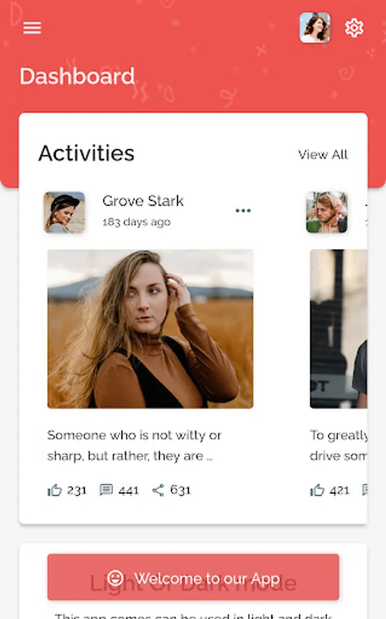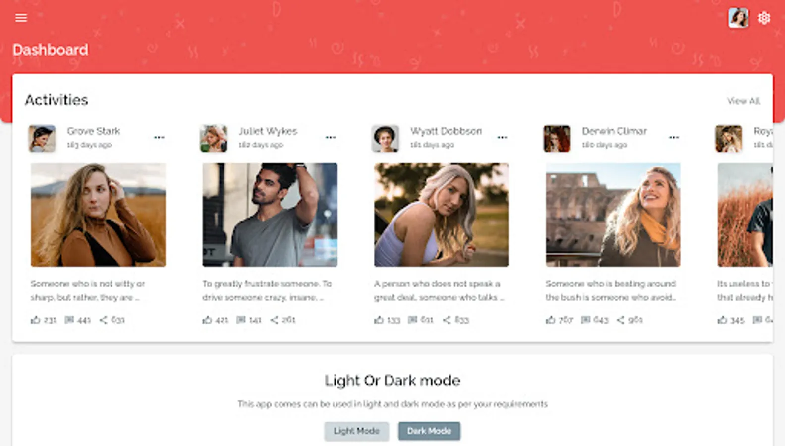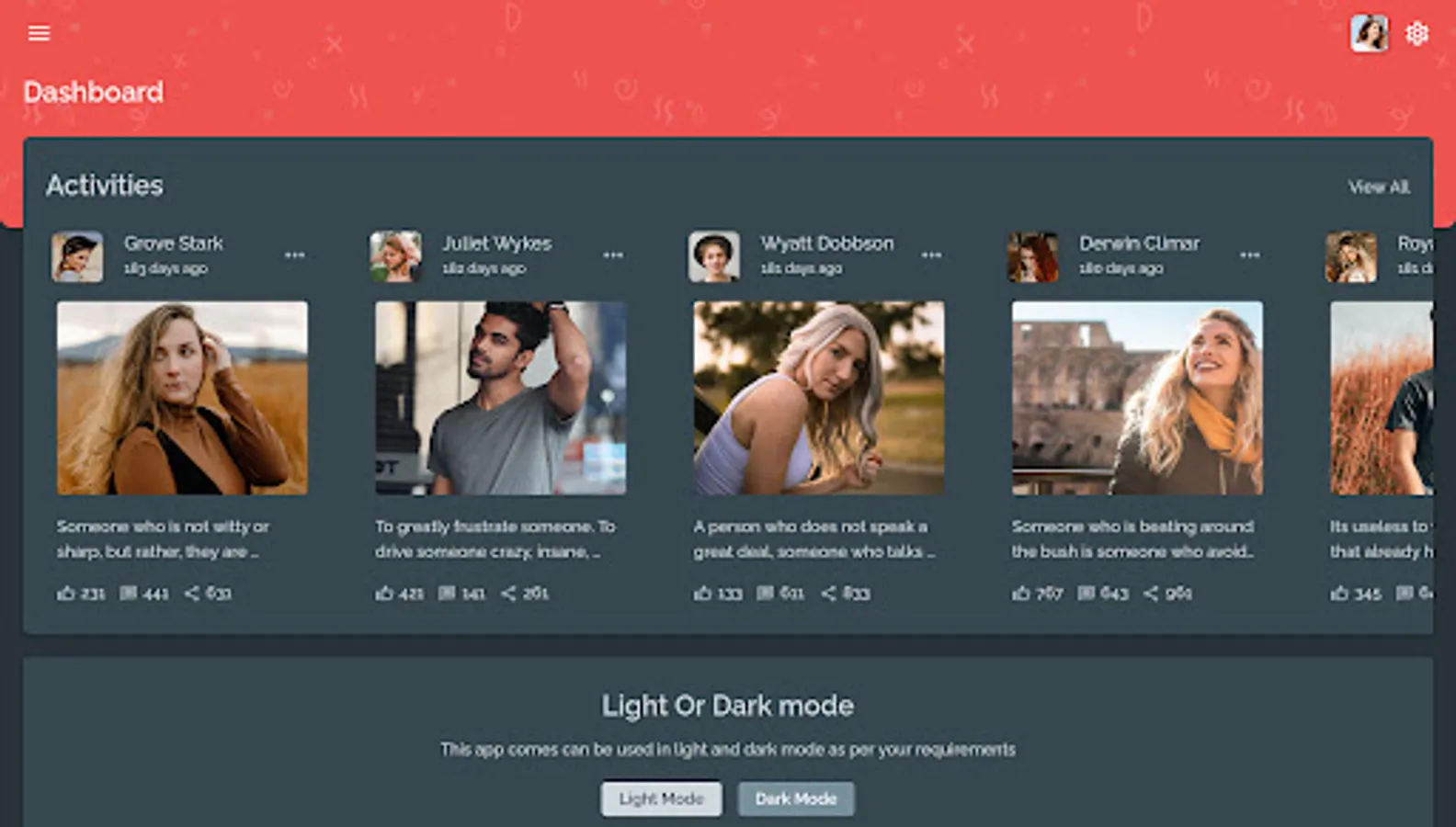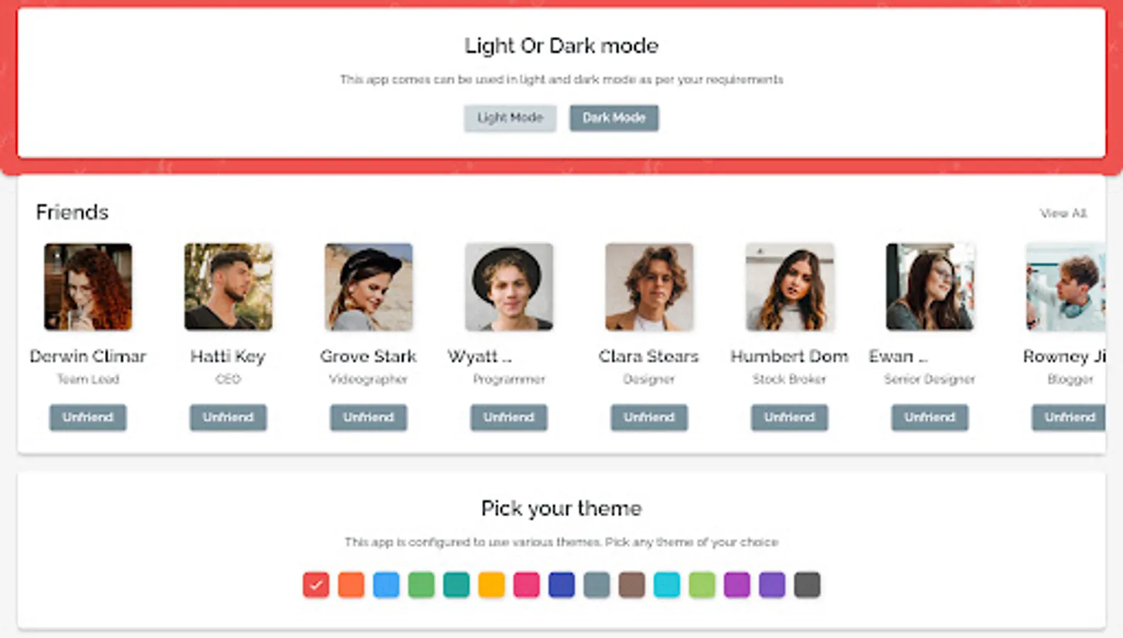 This app is integrated with light and dark mode. User can pick any mode as per their likings. You can set any mode as default mode as well. Both light and dark mode can be integrated with any theme, navigation color, top bar color.