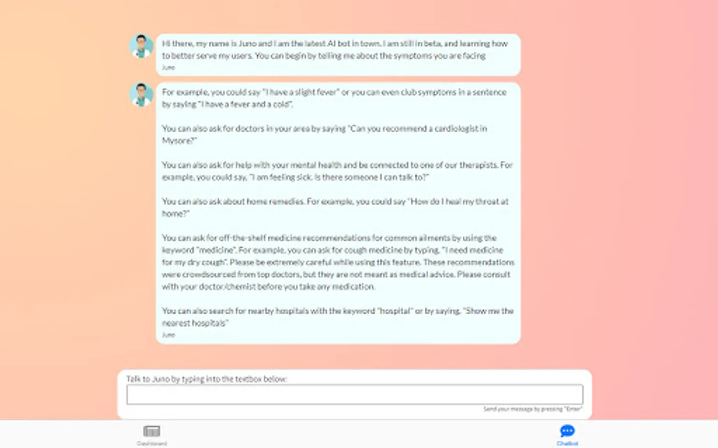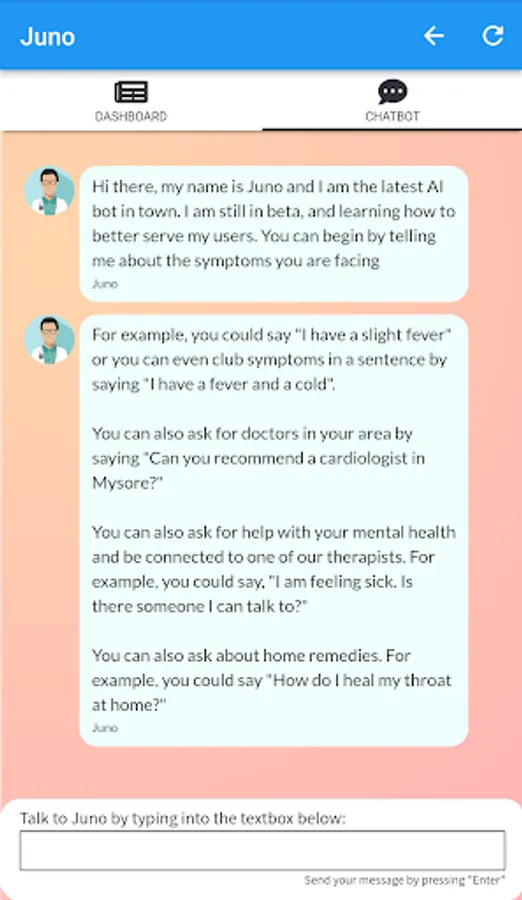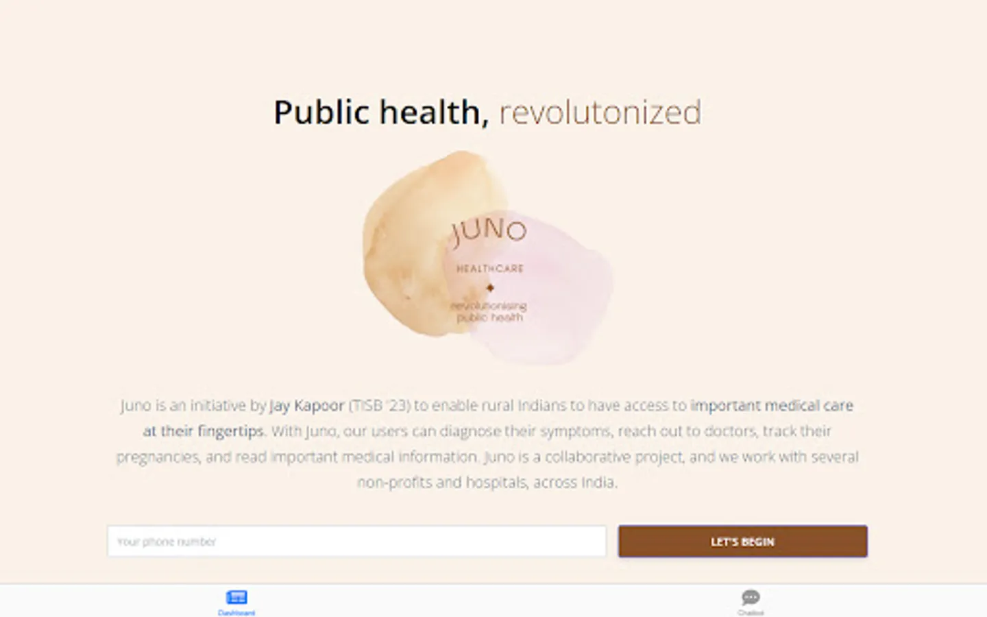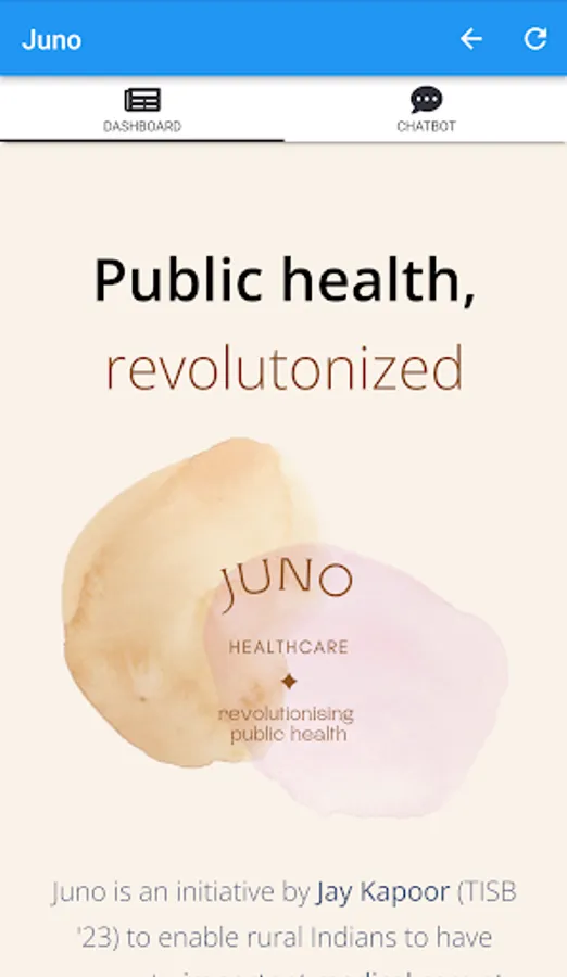 Juno is an initiative by Jay Kapoor (TISB '23) to enable rural Indians to have access to important medical care at their fingertips. With Juno, our users can diagnose their symptoms, reach out to doctors, track their pregnancies, and read important medical information. Juno is a collaborative project, and we work with several non-profits and hospitals, across India.