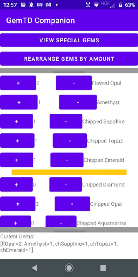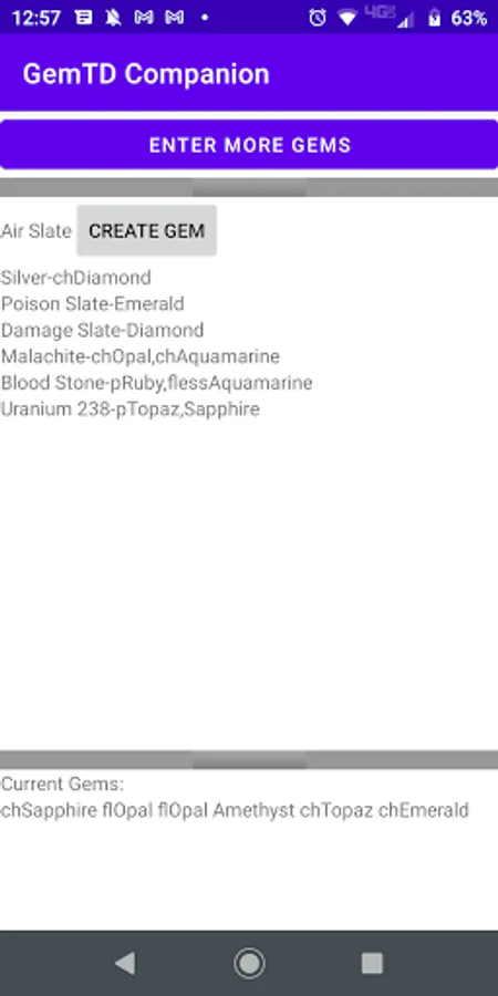 This app was made to assist with the game Gem Tower Defense (Gem TD). It allows users to enter the regular gems that they have collected in the game, and see what other gems they need in order to make a special gem. Without this application, it takes a lot of time to learn which gems make special ones, even if you use a pen and paper.