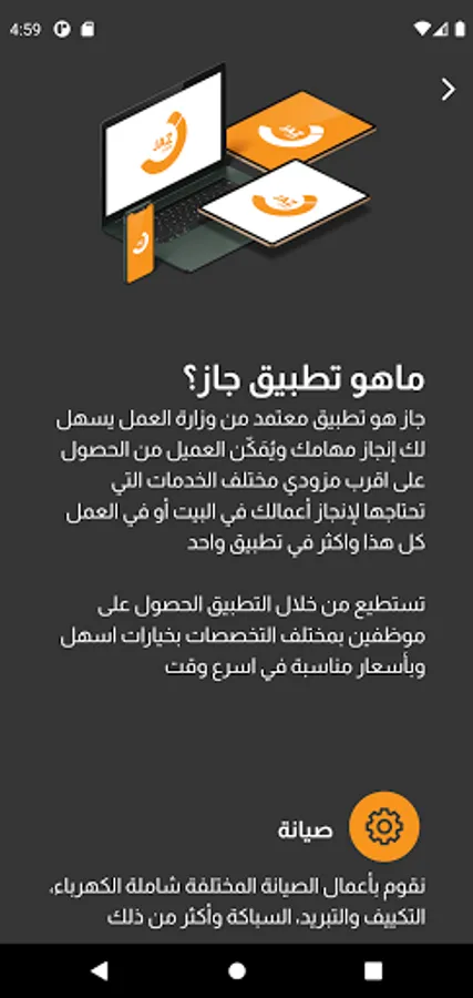 جاز هو تطبيق معتمد من وزارة العمل يسهل لك إنجاز مهامك ويُمَكّن العميل من الحصول على اقرب مزودي مختلف الخدمات التي تحتاجها لإنجاز أعمالك في البيت أو في العمل.