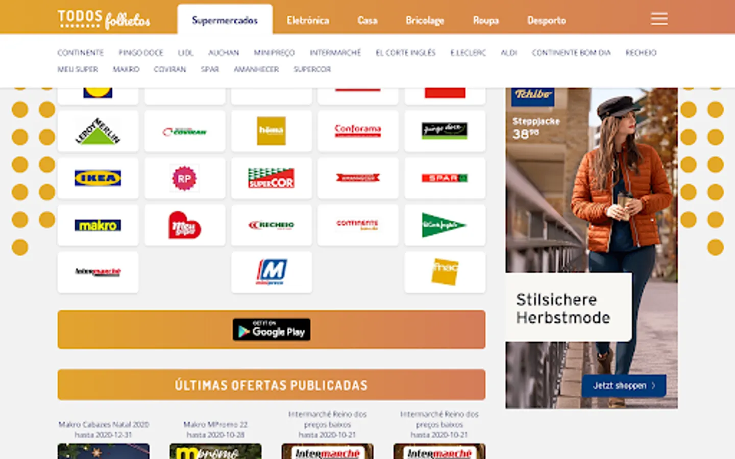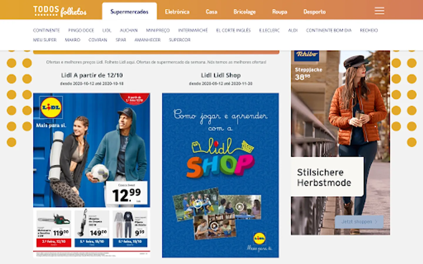 All brochures and catalogs of supermarkets (food, clothing, fashion, electronics, sports) in Portugal. https://www.todosfolhetos.pt/
