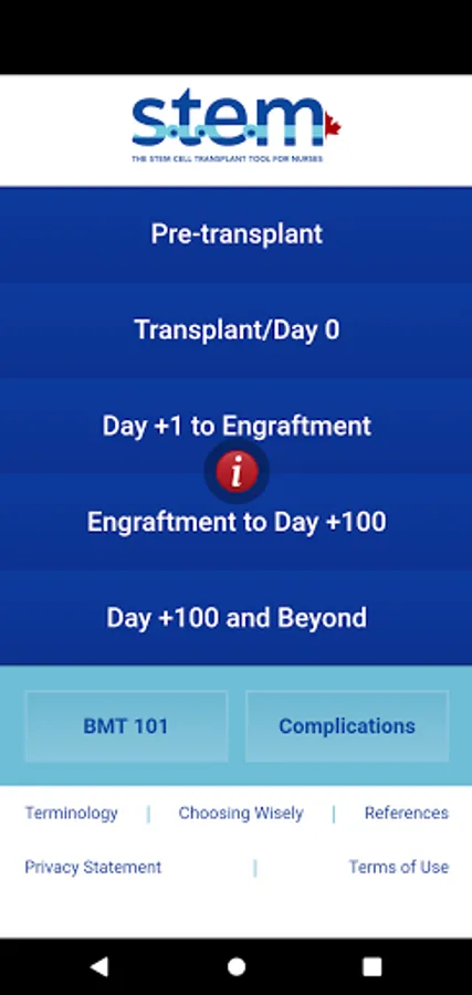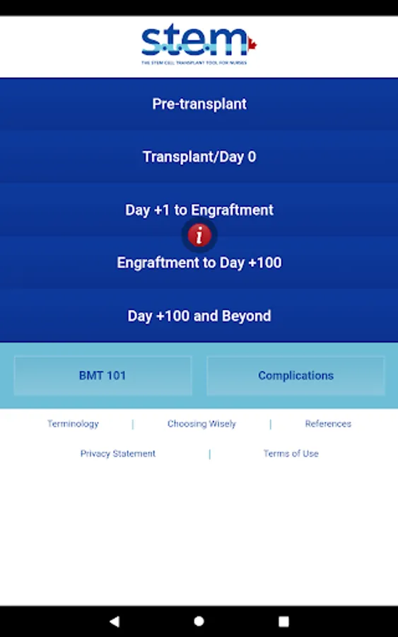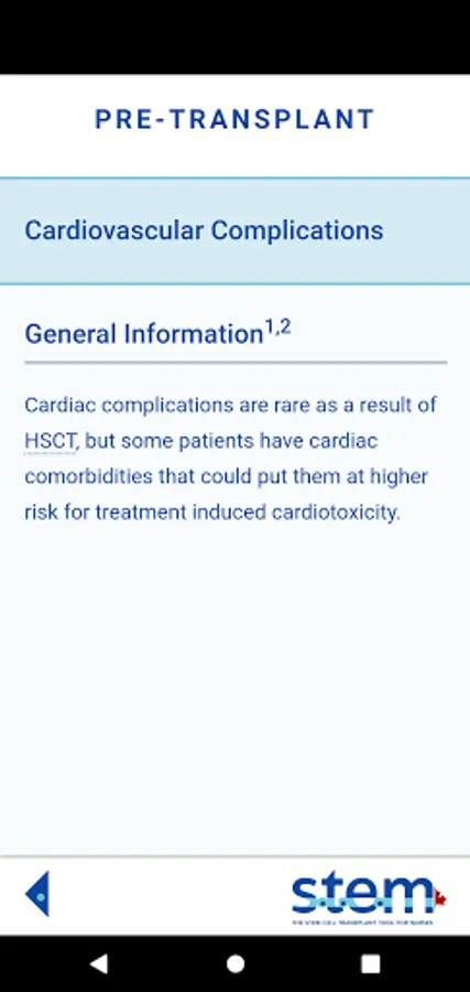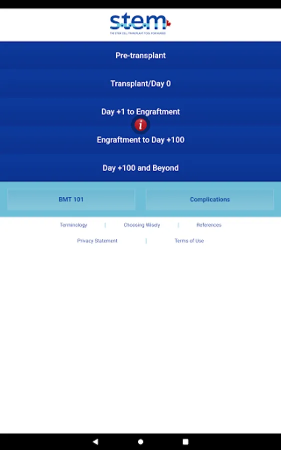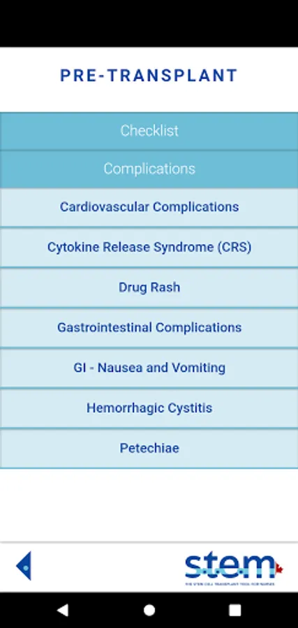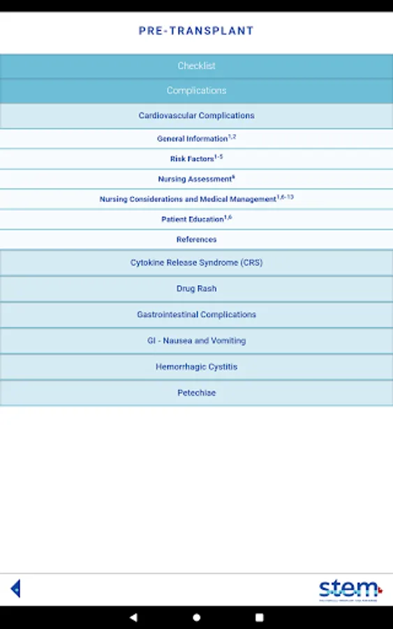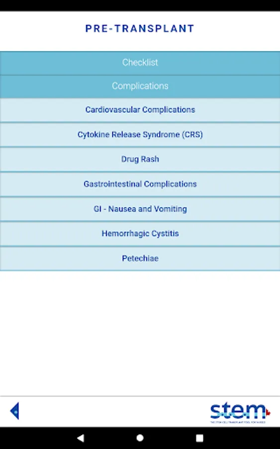 STEM is a mobile app designed by nurses for nurses to assist in the daily management of hematopoietic stem cell transplantation patients.