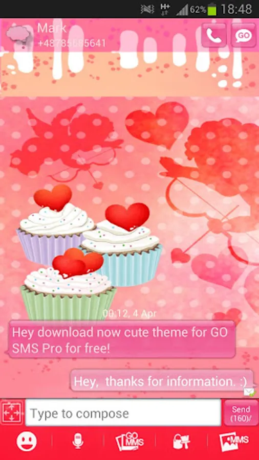 Cupcake Heart Theme GO SMS Pro Theme works only with GO SMS Pro application if you don't have it, download for free from Google Play.