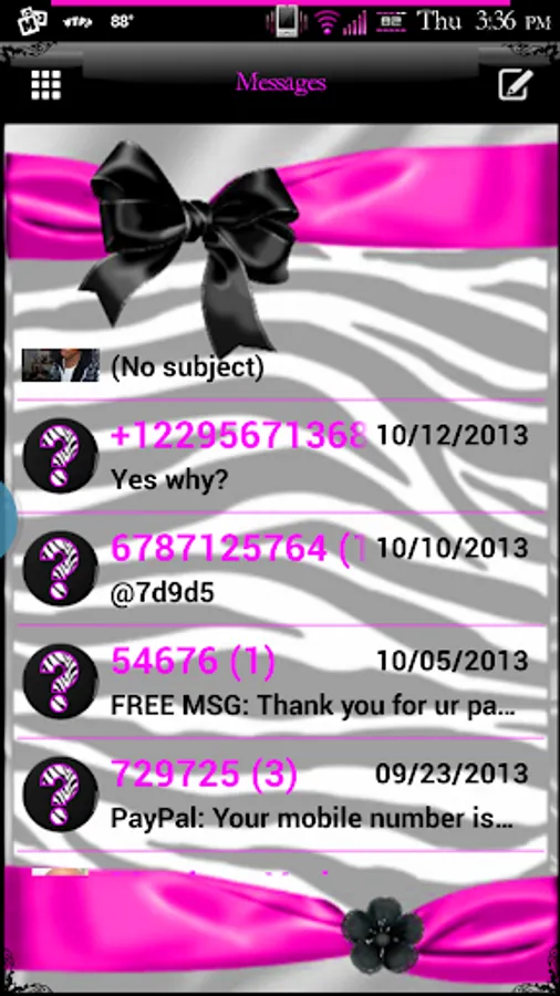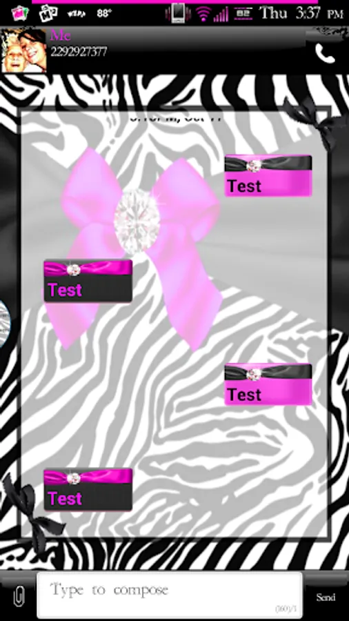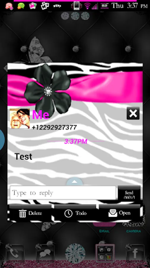 Zebra Love Go SMS Pro theme is made up of beautiful silk ribbons and bows, diamond studs, and gorgeous zebra patterns. It has such a beautiful pink tone with ebony black and white zebra print. This Go SMS Pro theme also features unique, one of a kind chat bubbles and a fully customized pop-up window for you to enjoy.