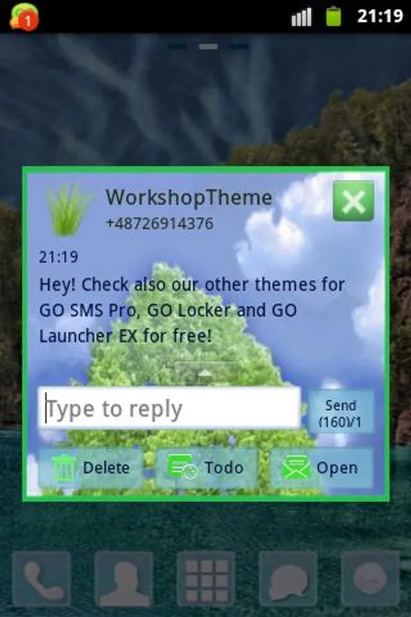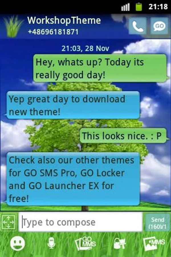 This a new skin for GO SMS Pro Theme = green grass and brown tree theme.