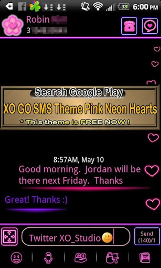 App Title: Pink Neon Theme ics: A skin / theme for GO SMS Pro Application. Ad-Free version.