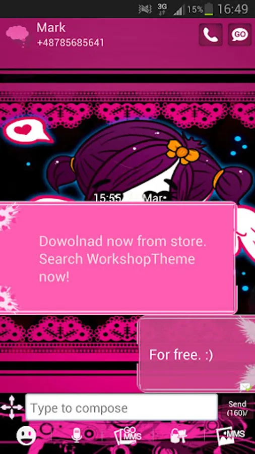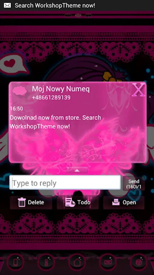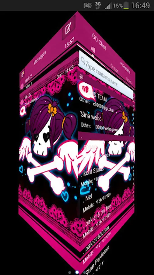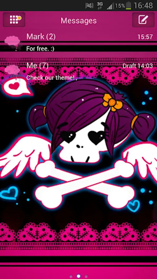New cute skin for GO SMS Theme = emo bone dark pink theme is sweet, emo, and purple and violet or rose them designed specially for girls/girly style.