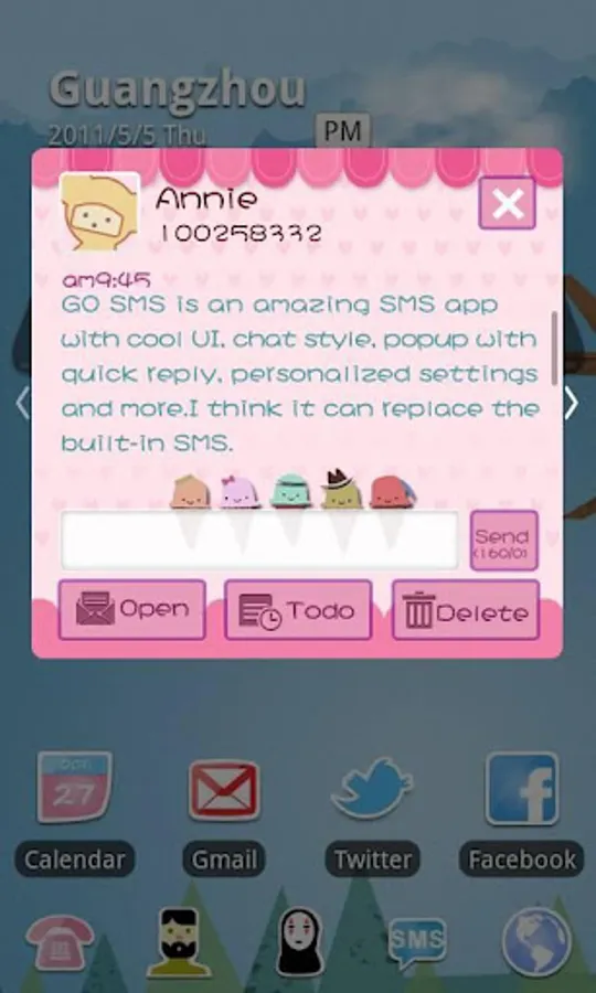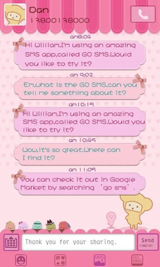 Pink Sweet theme for GO SMS Pro is available now! Designed and developed by GO SMS Dev Team. Cute, sweet, pink, fantasy, what's more, this theme embeds a matched font(Need the support of LATEST version of GO SMS Pro), suggest downloading the font to make theme nicer.