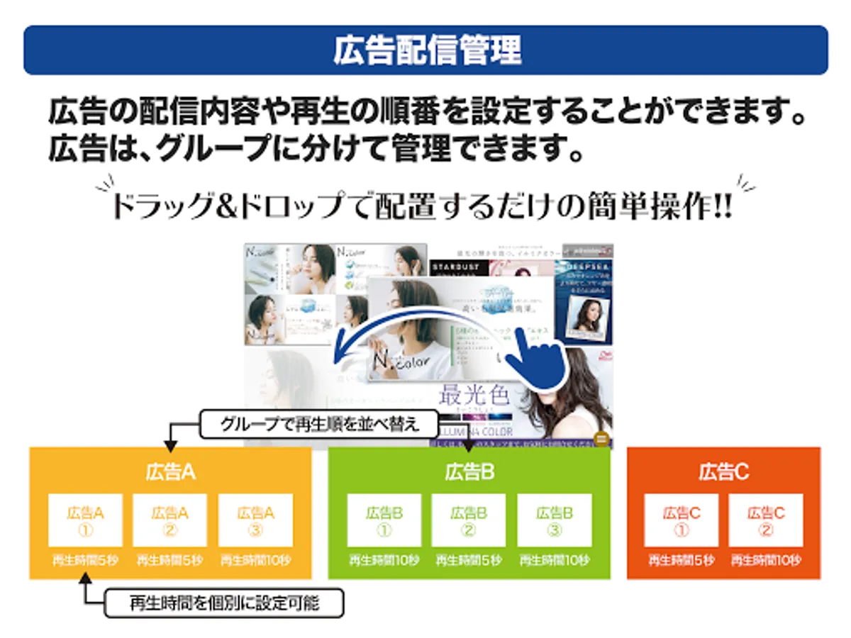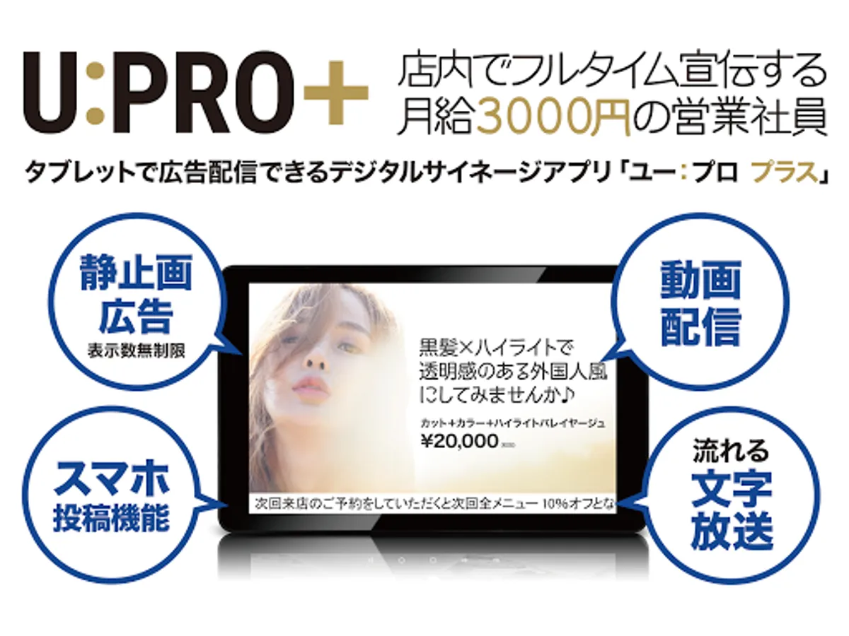 U: PRO + is a digital signage app that allows you to use your tablet to distribute advertisements such as menus and campaigns at stores such as beauty salons and restaurants.
