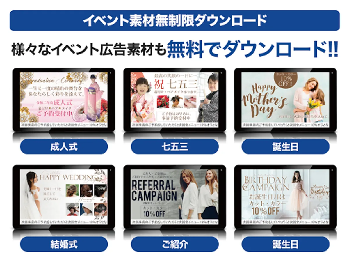 In addition, you can use event campaign advertisements such as birthday, Mother's Day, Father's Day, Valentine's Day, coming-of-age ceremony, entrance ceremony, graduation ceremony, Shichigosan, friend / family introduction campaign etc. for free.