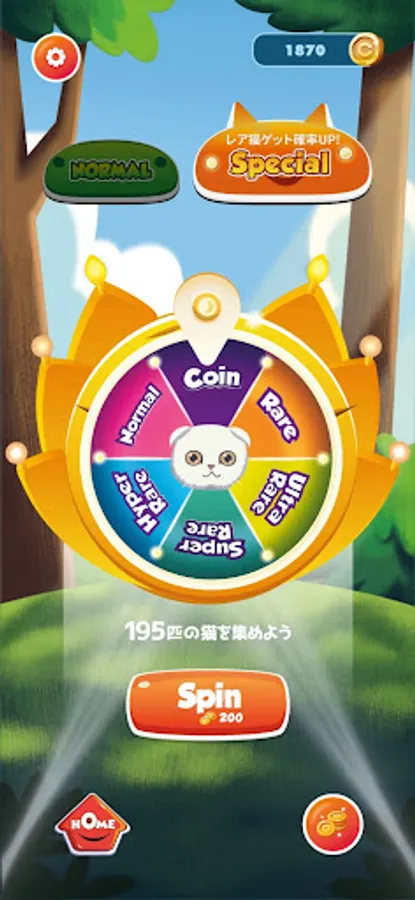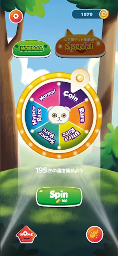You can earn coins by answering about 20,000 trivia quizzes created by 48 writers. By using the coin to spin the lottery, you can win cats that are ranked from normal to hyper rare. You can keep the acquired cats in your own "Cat Room". In addition, you can earn bonus coins if you answer 5 questions correctly in a row. Please use your knowledge to collect cats!