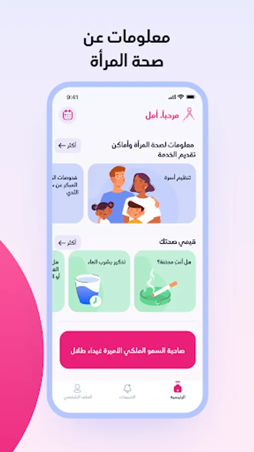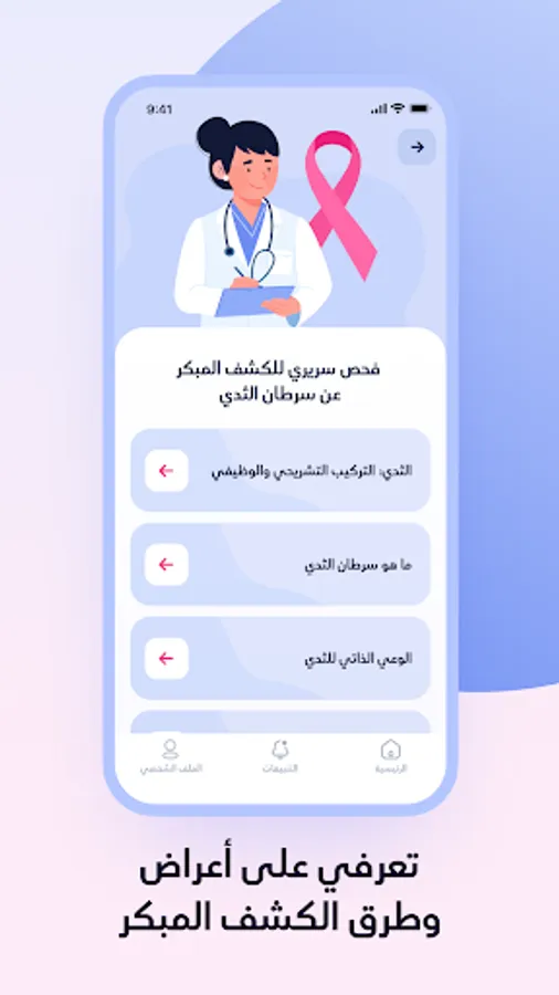 The "Your Health in Pink" application aims to increase your awareness of the priority of taking care of your health without trouble. It will also help you to regularly conduct early detection tests for breast cancer. In addition to many important health practices.