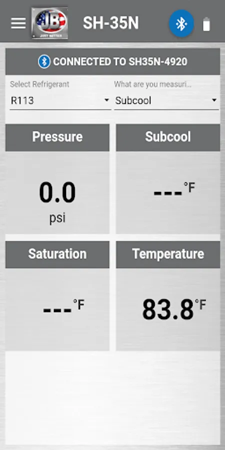 Wireless pressure temperature gauge from JB Industries. Allows measurement of pressure, temperature, saturation temperature, superheat, and subcool. The app allows the user to program up to 5 favorite refrigerants into the device and update the firmware. The app allows system monitoring all from one screen.