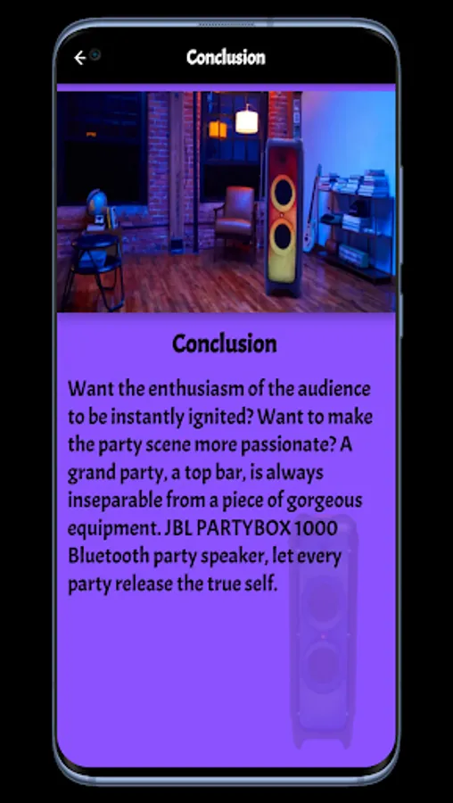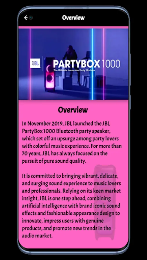 The JBL PartyBox 1000 Guide application contains many information and features of the JBL PartyBox 1000, which you can get in a clear and easy way. You can also through the JBL PartyBox 1000 Guide application, watch a video clip of the JBL PartyBox 1000, which gives you the opportunity to learn about the appearance and features of the JBL PartyBox 1000 Guide It also has many different features, including JBL Signature Sound JBL offers unprecedented performance and authentic audio experiences that you will remember for your party!, Light Shows
