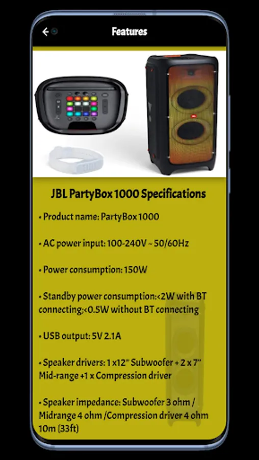 Through the JBL PartyBox 1000 Guide application, you can also get many pictures and different colors of the JBL PartyBox 1000, through which you can view them and choose the thing that suits you. Through which you can learn how to handle, use, install and charge the JBL PartyBox 1000 Bluetooth technology, Air Gesture wrist strap using BLE technology, Features, 3.5 mm audio cable input, Auto power off, Bluetooth