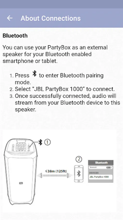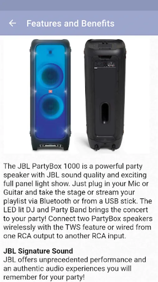 There are explanations such as JBL PartyBox 1000 overview, connections, troubleshooting be found on the app. The JBL PartyBox 1000 speakers have huge sound output, DJ features, rich connectivity options and lighting effects.