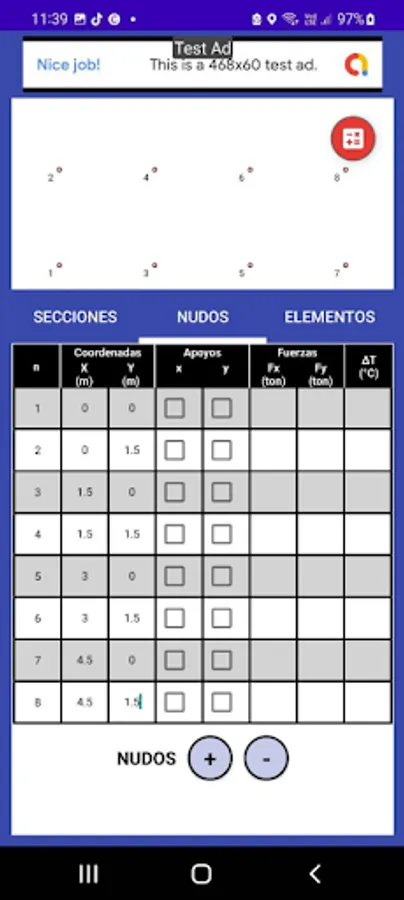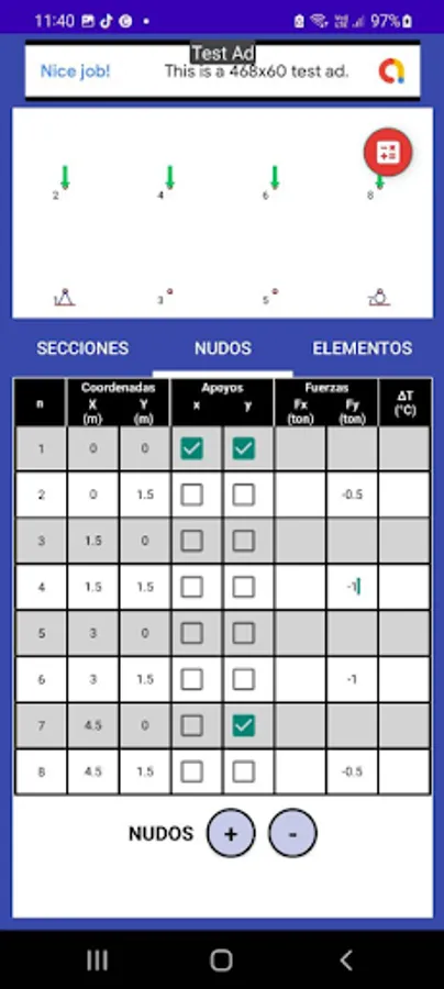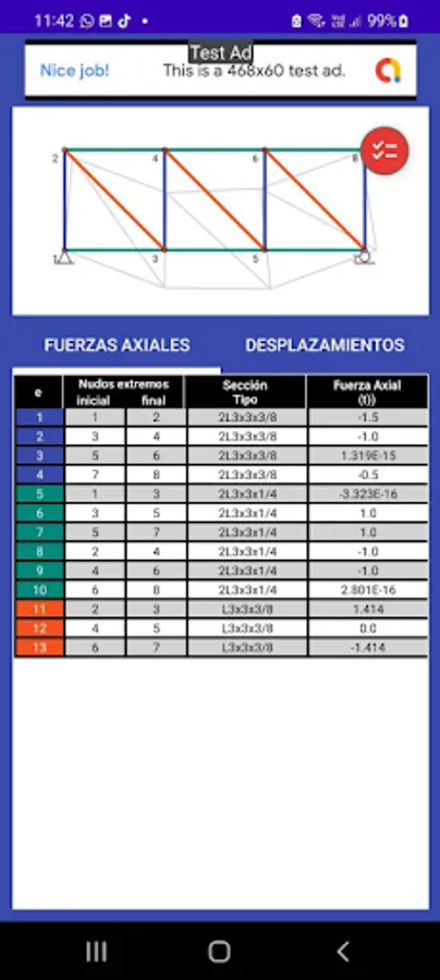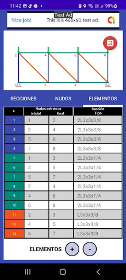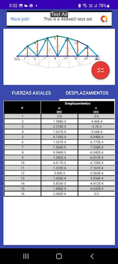 This application will allow you to analyze in a simple and fast way any structure made up of bi-articulated elements such as trusses or flat reinforcement (2D).