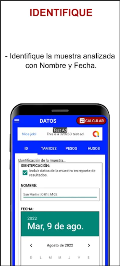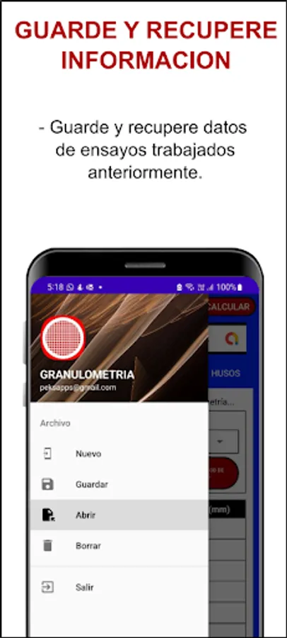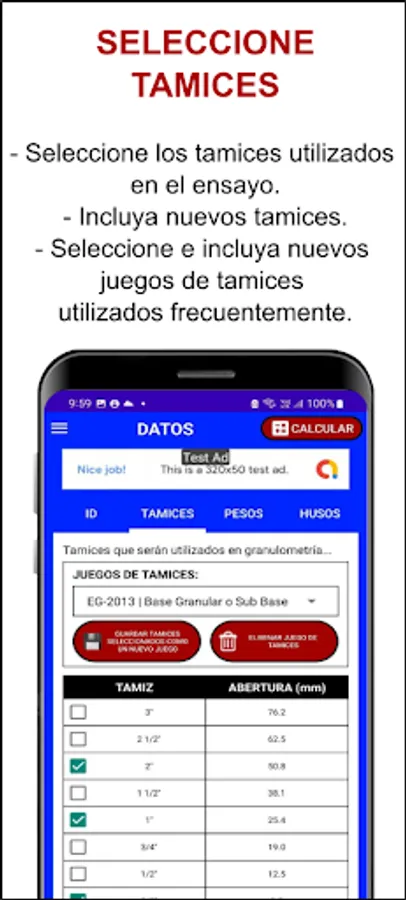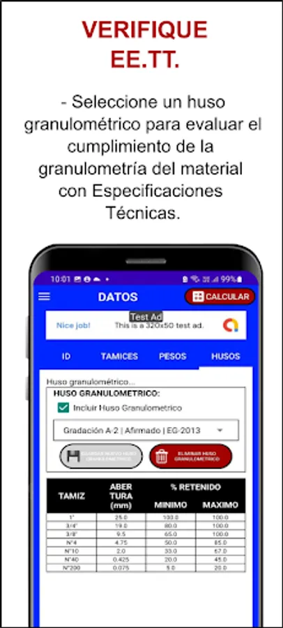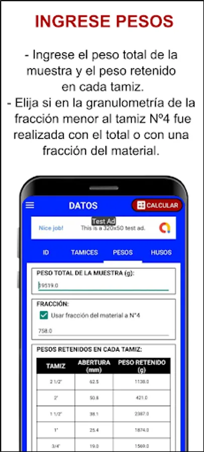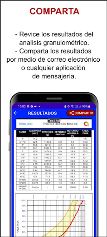 It presents a table with the weights retained, % partial retained, % accumulated retained and % that passes for each sieve.