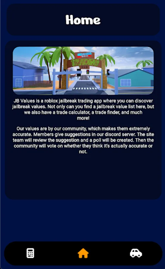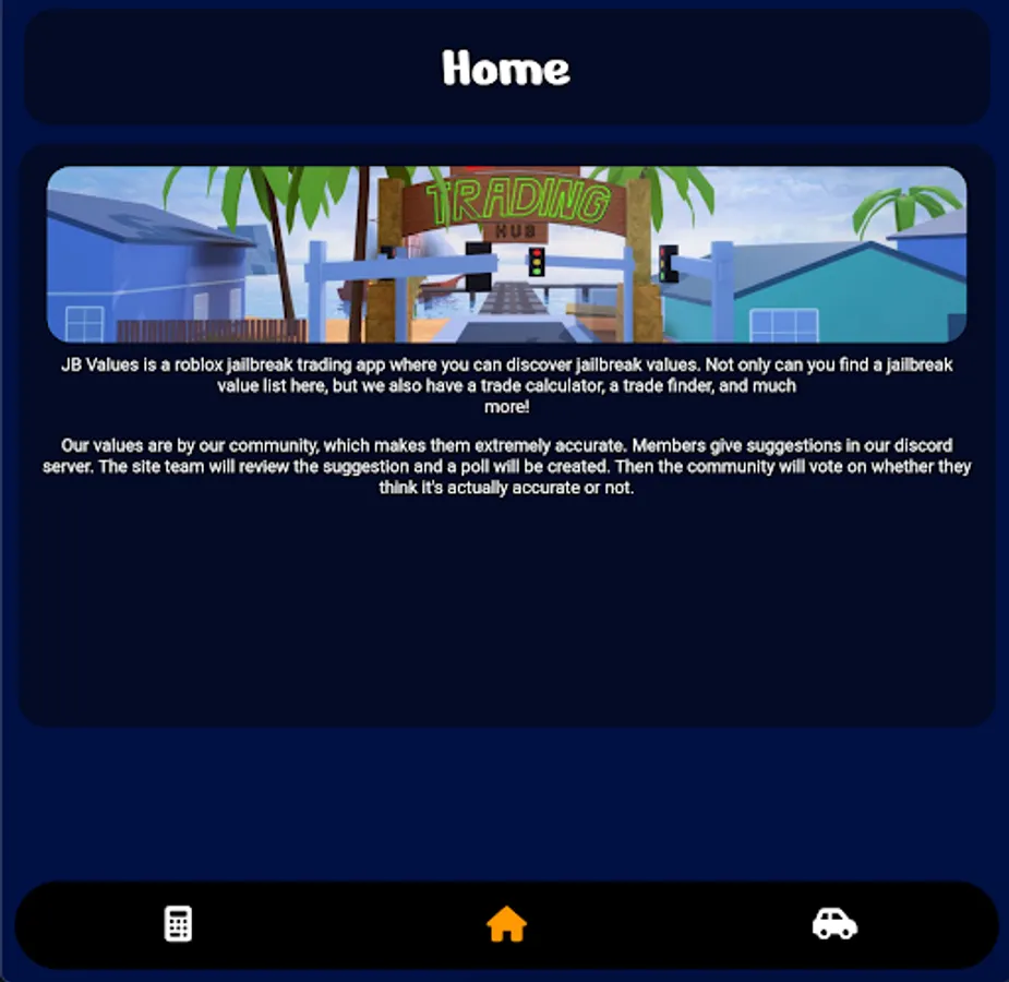 JB Values is a jailbreak trading website where you can discover jailbreak values. Not only can you find a jailbreak value list here, but we also have a trade calculator, and much more!