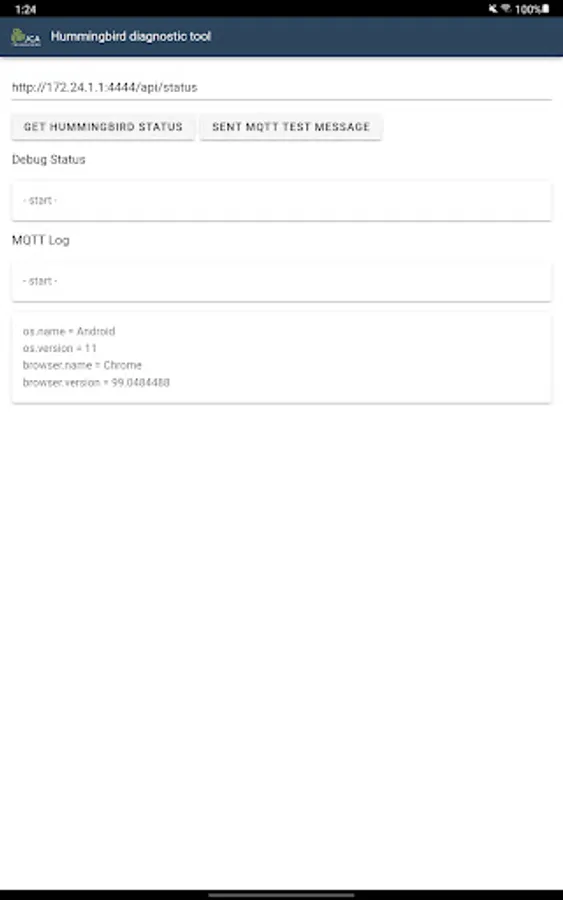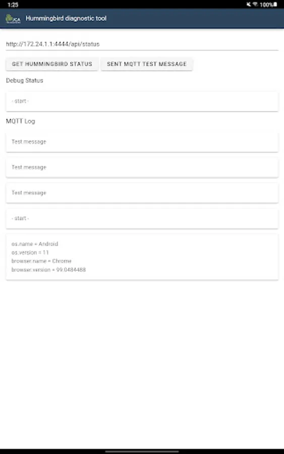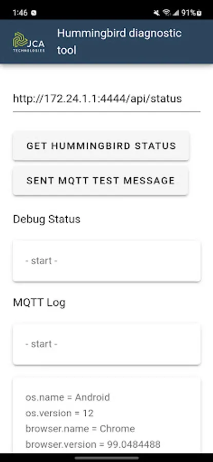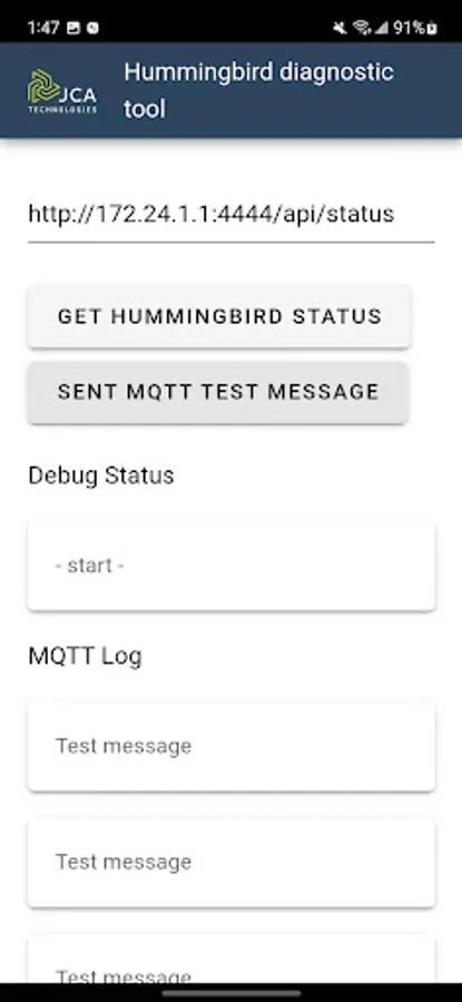 The JCA Hummingbird Diagnostic Tool is able to test the operational status of your Hummingbird controller. The app listens to periodic diagnostic messages sent from the controller.