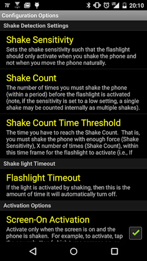 2) Activate all the time (e.g. Regardless if screen is on/off, when shaken, turns flashlight on)
