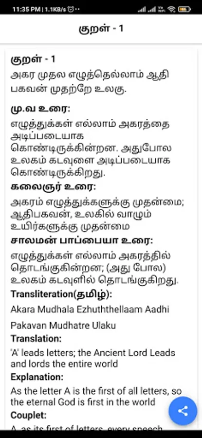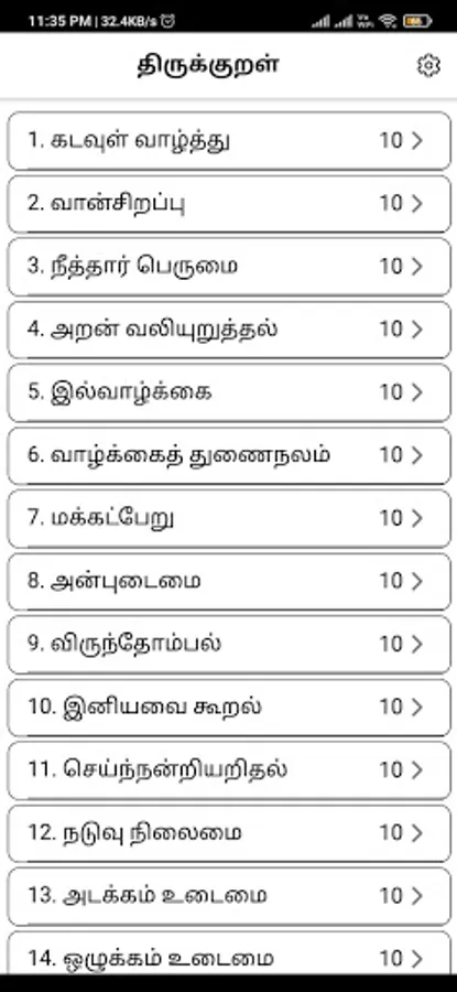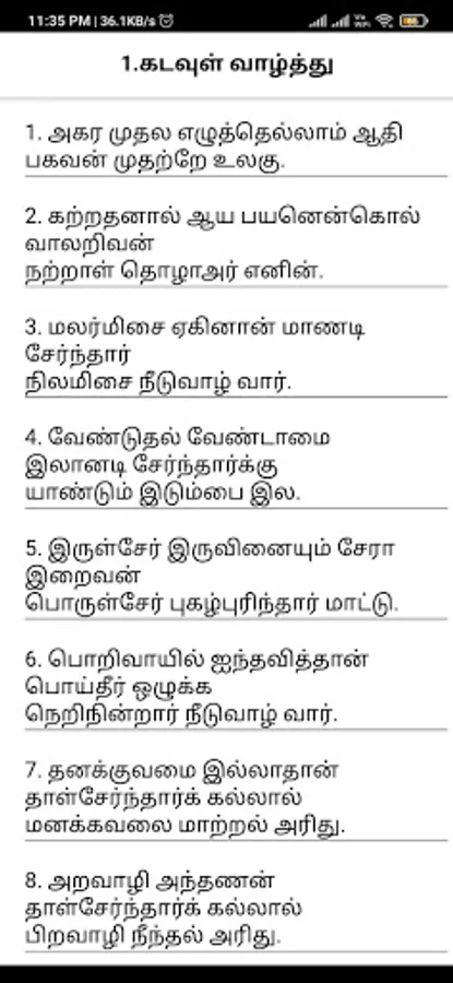 The Tirukkural, or shortly the Kural, is a classic Tamil language text consisting of 1,330 short couplets of seven words each, or kurals. The text is divided into three books with aphoristic teachings on virtue, wealth and love, respectively.