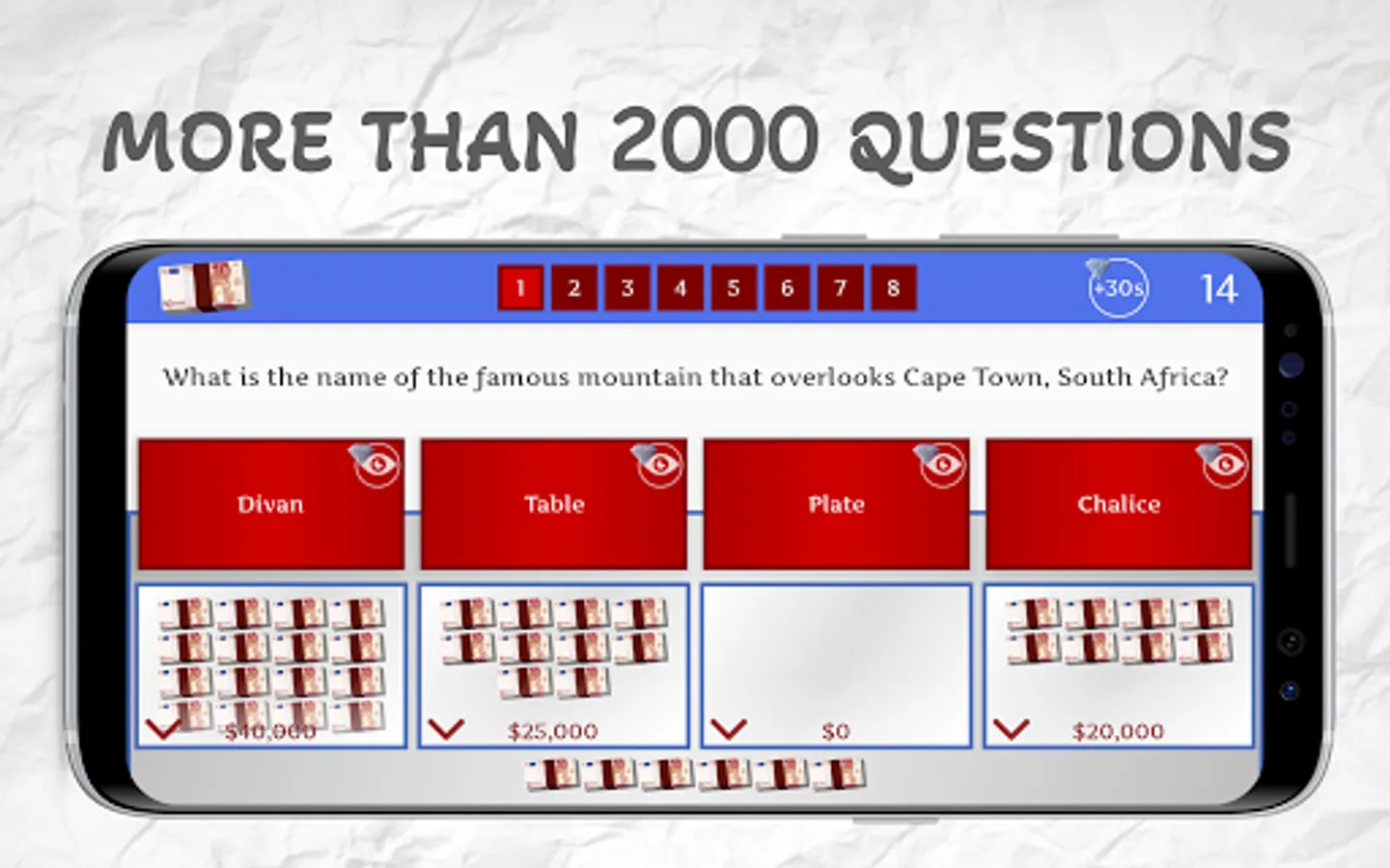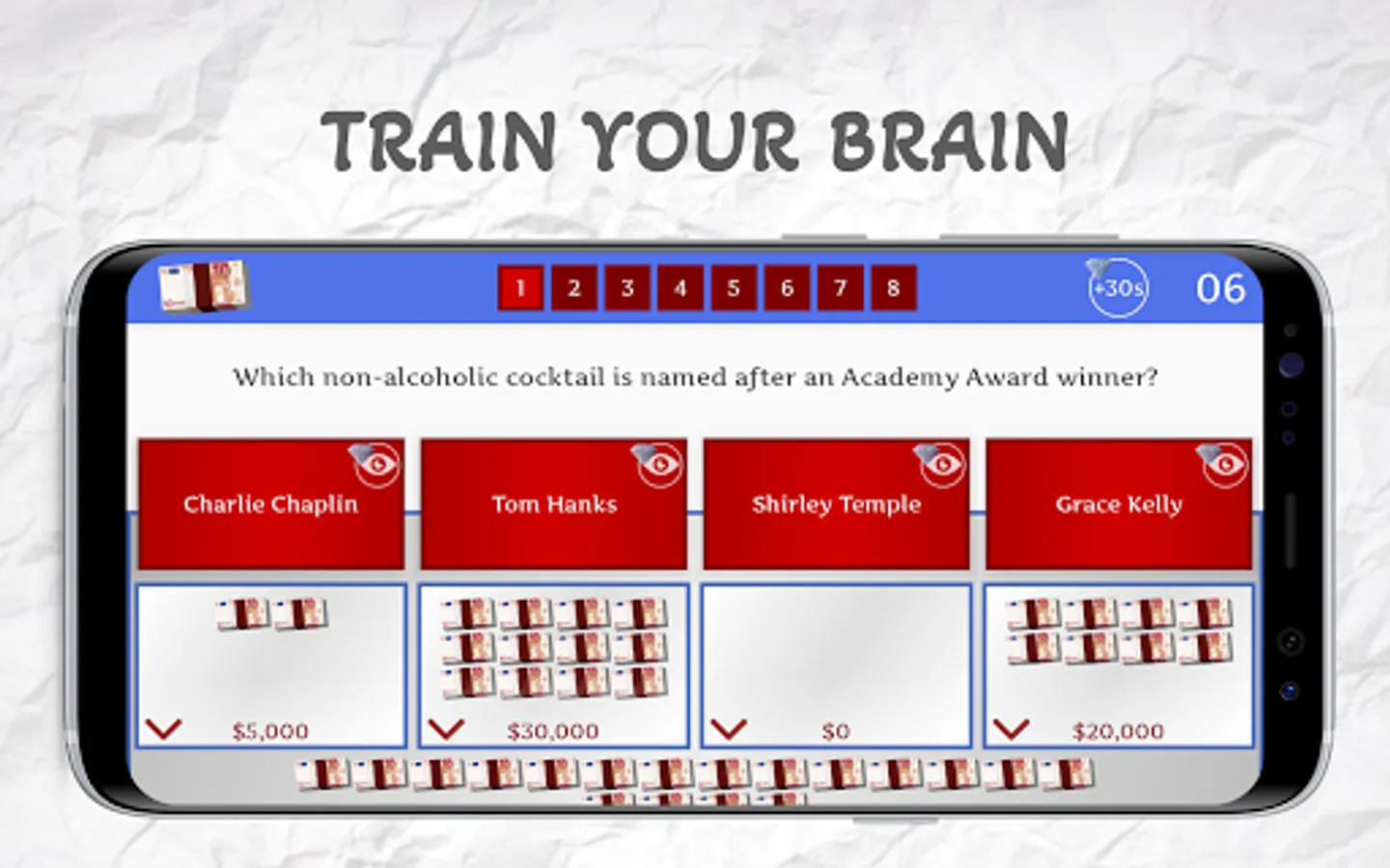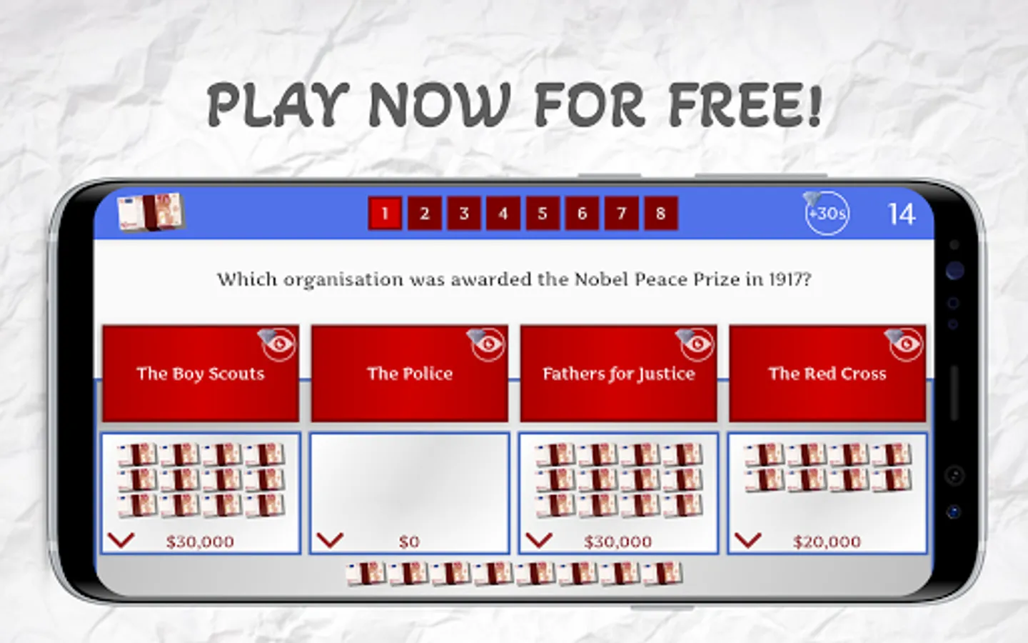 If you can put any of the money wads on the correct answer to question number 8, you will have passed this level and you will get a free diamond.
