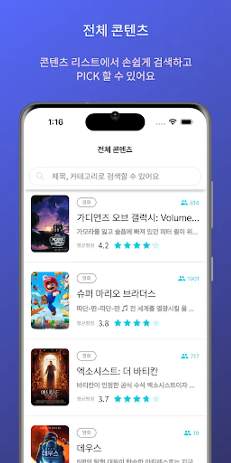 : Provides a list of various contents by genre. You can also check information about content you haven't seen yet.