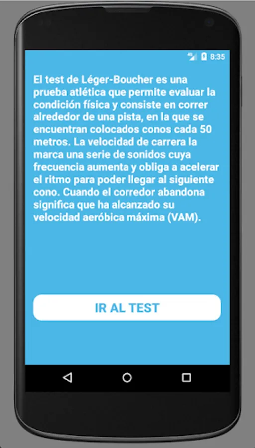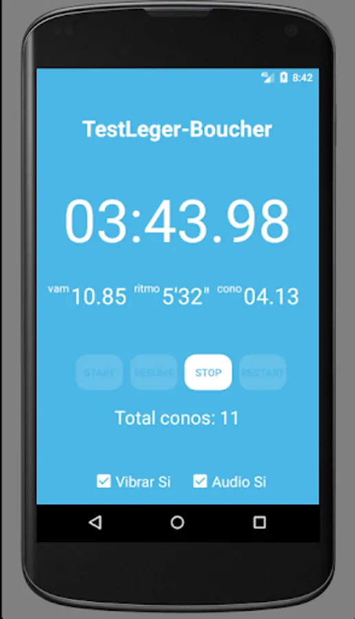 The test starts at the speed of 9km/h and every two minutes the speed is increased by 1km. the application allows you to listen to an audio in each cone, vibration warning or both, being able to disable any of the options, for the user's convenience.