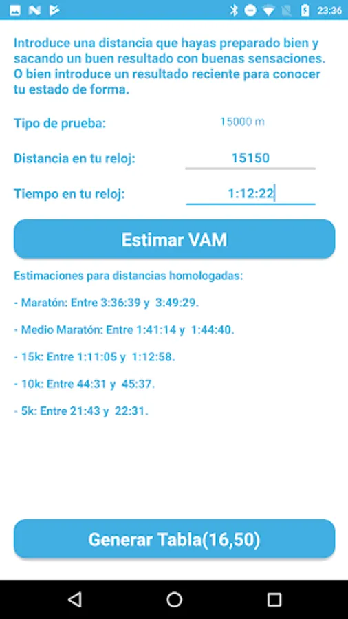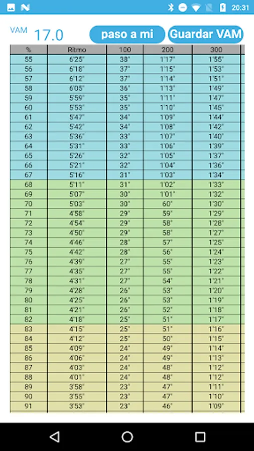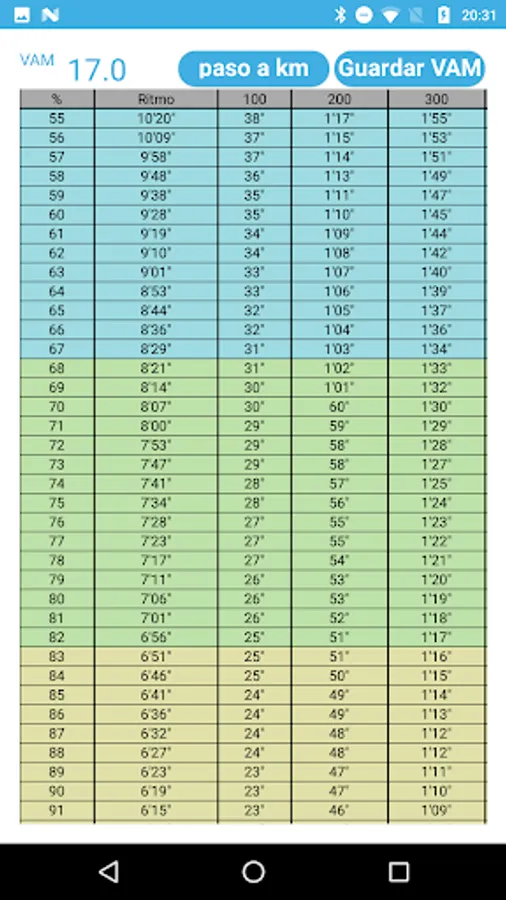 In the generated table you can see the columns of % of the VAM, equivalent pace in minutes and seconds per km and the real time in which the athlete has to travel the distances from 100 meters to 900 meters, to meet the desired pace.