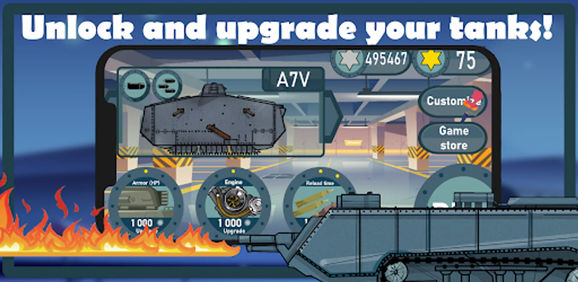 Unlock and upgrade real WWI tanks by completing missions. You can try out tanks from France, England and Germany and much more.