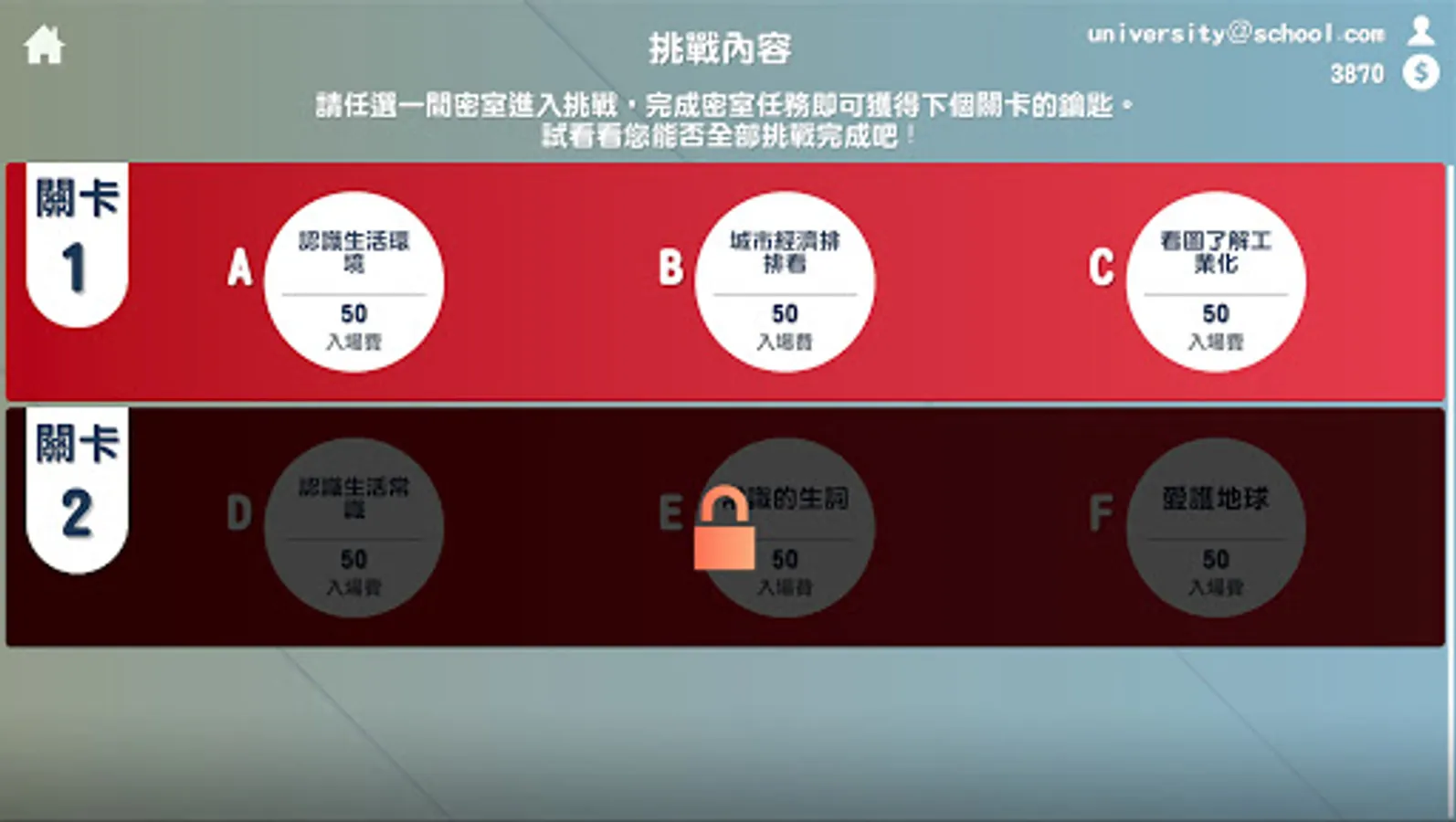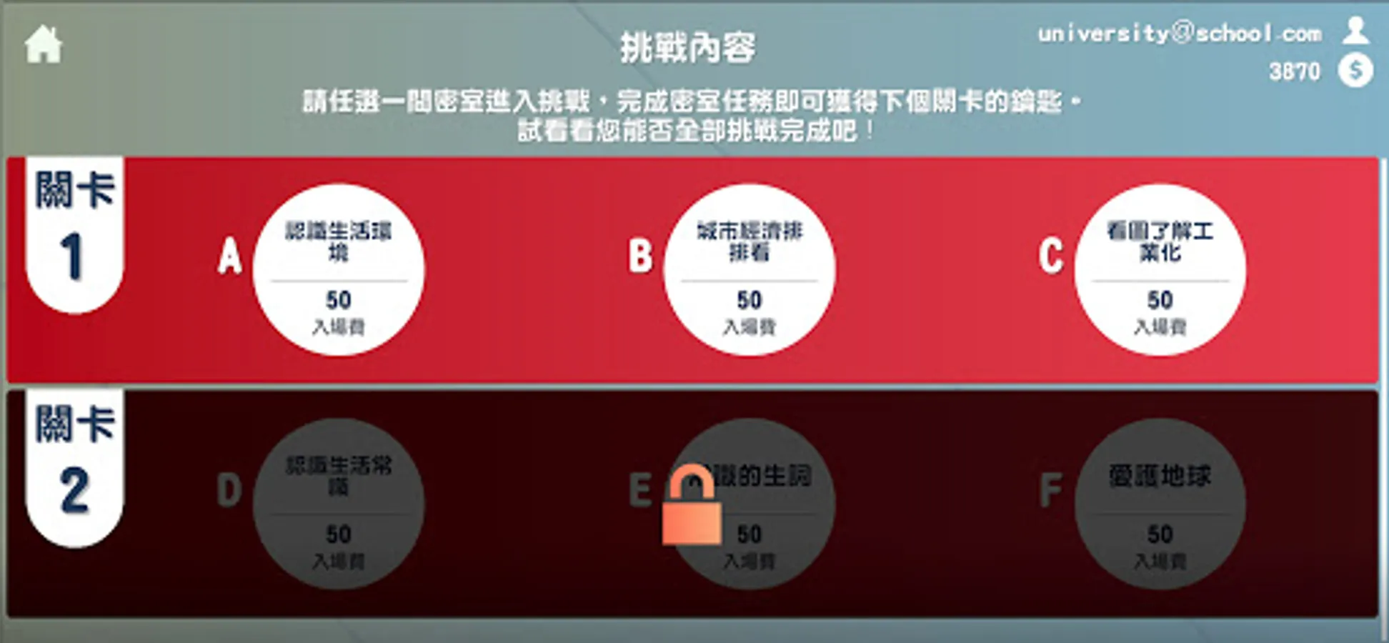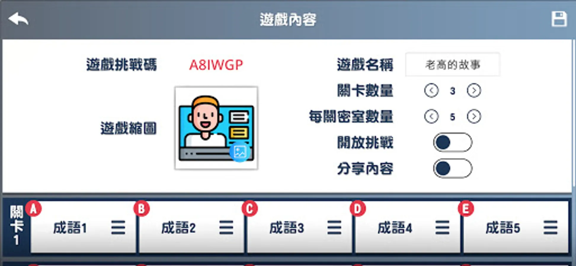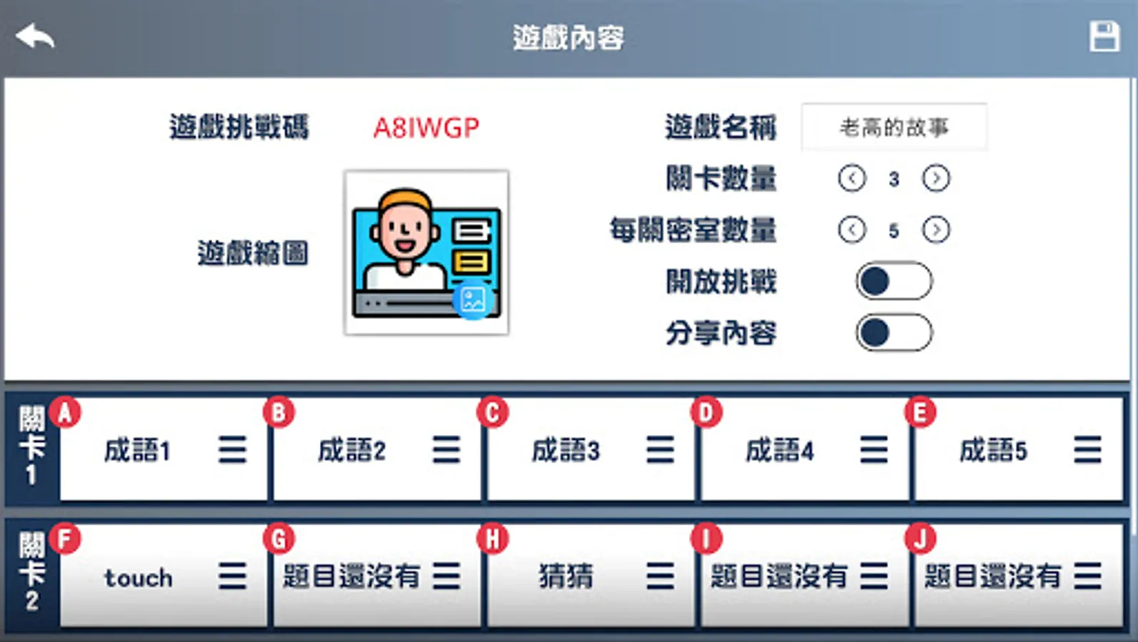 Smart Challenge is a game that combines puzzle-solving games to enhance the fun of learning. In the process of solving puzzles, improve the players' familiarity with knowledge and enhance the opportunity of application. According to different learning stages and corresponding learners, teachers can design levels by themselves and combine puzzle-solving to improve learners' fun in learning.