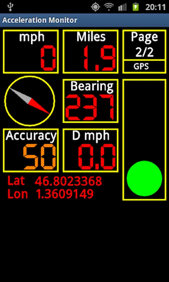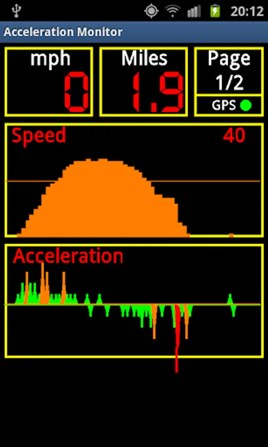 An app to monitor your speed and acceleration. Low accelerations shown green, medium in orange and high in red. All relative and dependant on the GPS for accuracy.