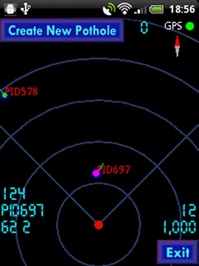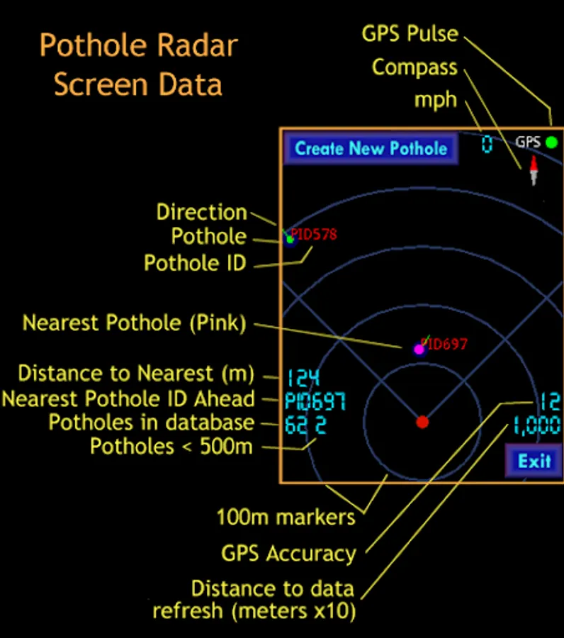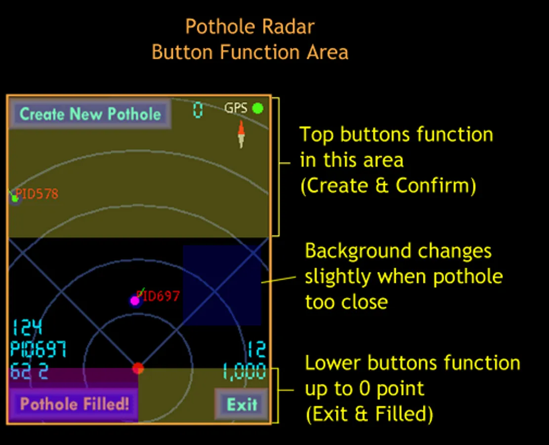 The app uses your GPS location to find potholes marked by you and others nearby. It then plots them on a radar screen for you to see and gives an audible warning as they approach. When a pothole is less than 50 meters away, you can confirm it is there or mark it as filled.