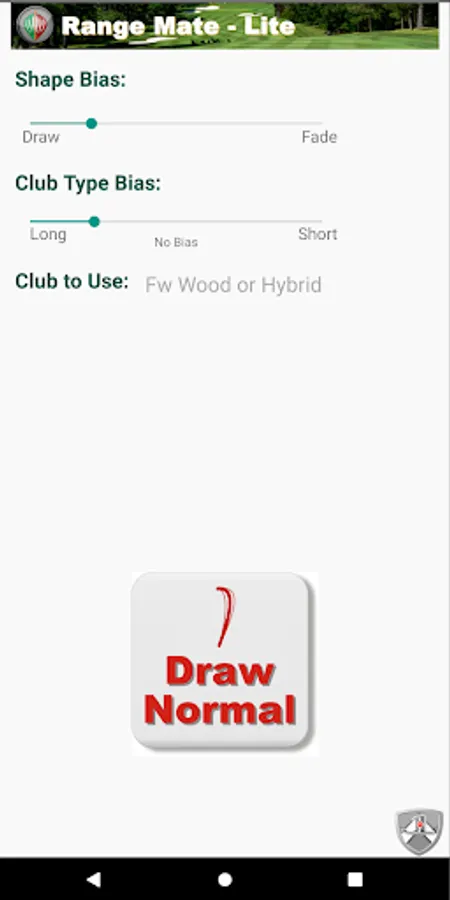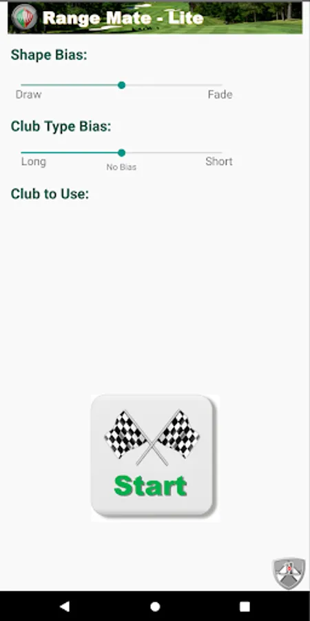 Range Mate - Lite is a golf practice utility. Range Mate - Lite simulates shot types required on the golf course at the range. The utility presents the golfer a range of shot types and trajectories (i.e. from high draw to low fades) and using a slider bar the bias for a particular type of shot can be specified that will increase the likelihood of the golfer being presented with the type of shot they are working on. Similarly the golfer can add the club type bias that increases the likelihood of them being asked to hit a given shot with a particular type of club (i.e. driver, mid Iron, wedge etc).