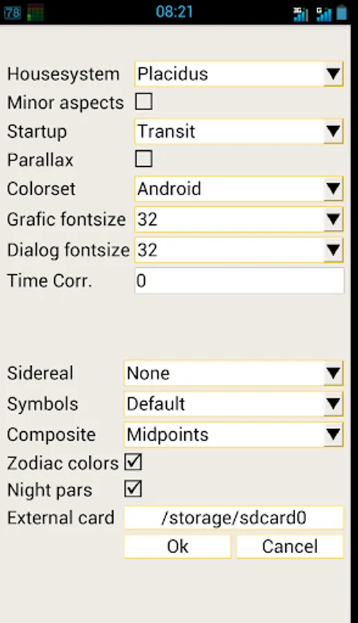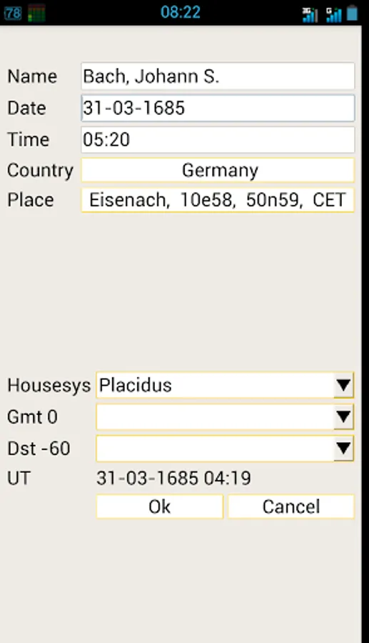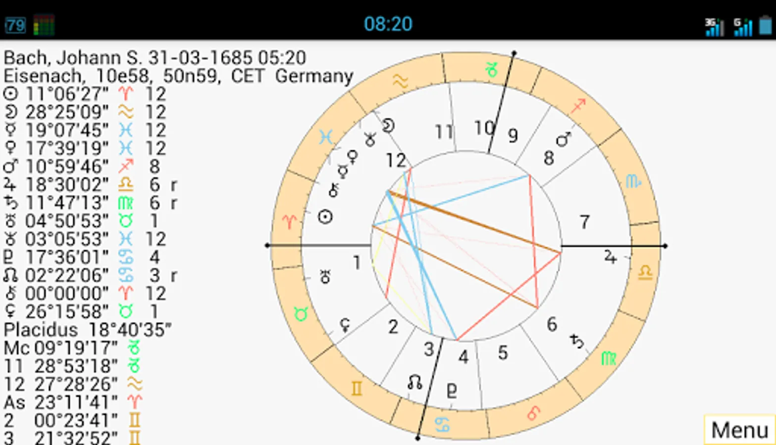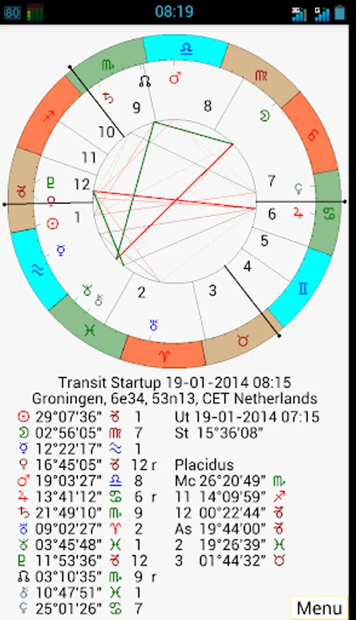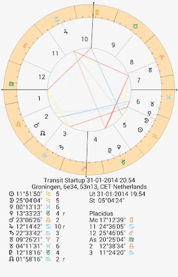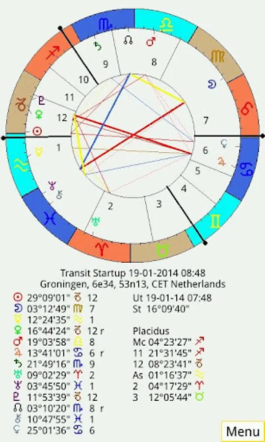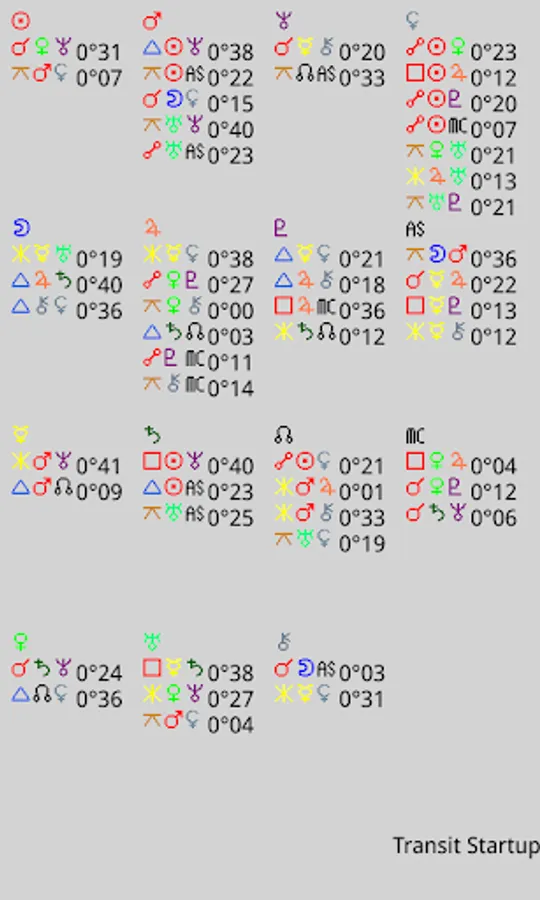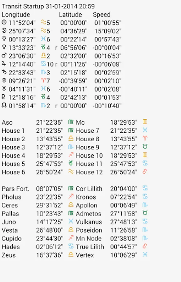 - Several screens with all kinds of data like latitude / speed of planets, true asc / mc and housecups, aspects, midpointtrees, asteroids, uranian bodies, dignities, planetpatterns, planet nodes etc.