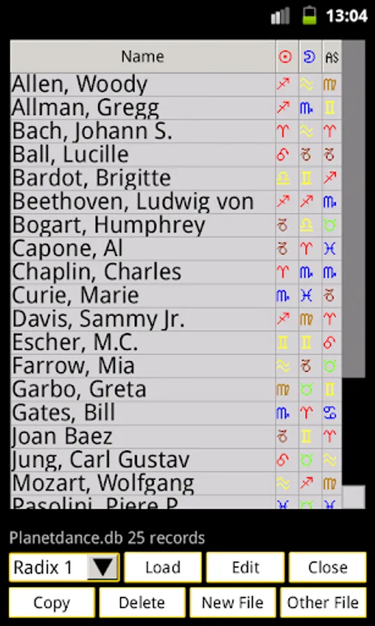 - Database manager for horoscopes, Delete or Edit Horoscope, Create other databases, Copy horoscopes between databases.
