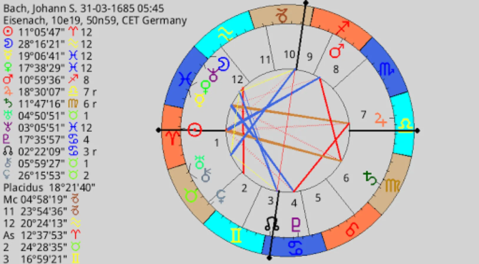 - Eleven housesystems: Placidus, Koch, Campanus, Regiomontanus, Equal, Vehlow, Porphyrius, Whole Sign, Axial Rotation, Azimuthal, Polich, Alcabitus, Morinus, Krusinski-Pisa.
