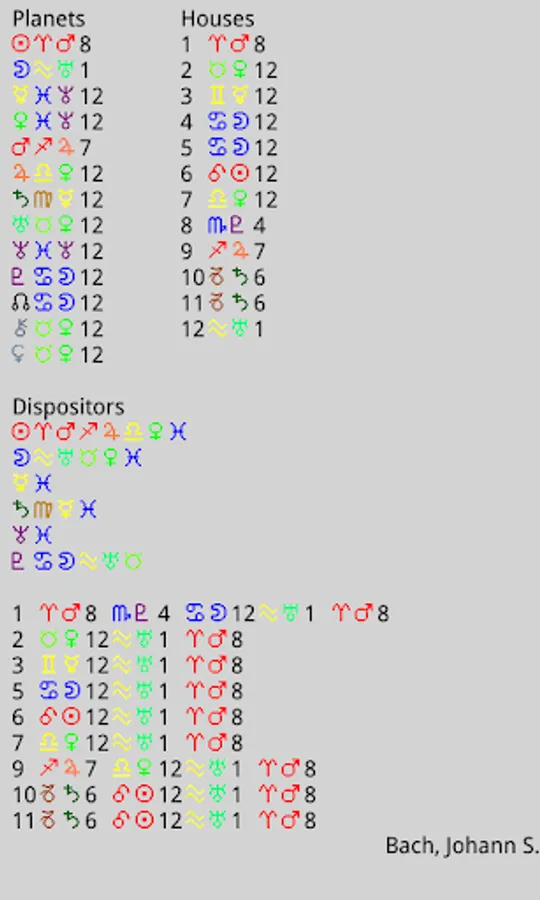 - Fixed stars, Rulers and dispositors, Midpoint tree, Parallax, Dignities, Aspect patterns, Arabics.