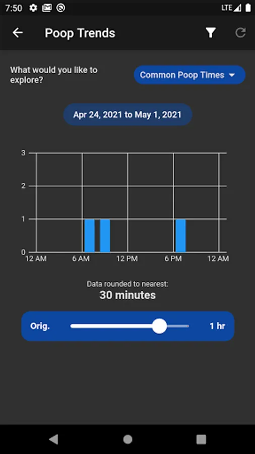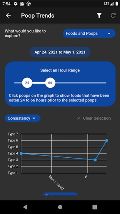 - Observe trends and graphs to help you and your health care professional identify patterns between the foods you eat and your poops in the last 7 days.