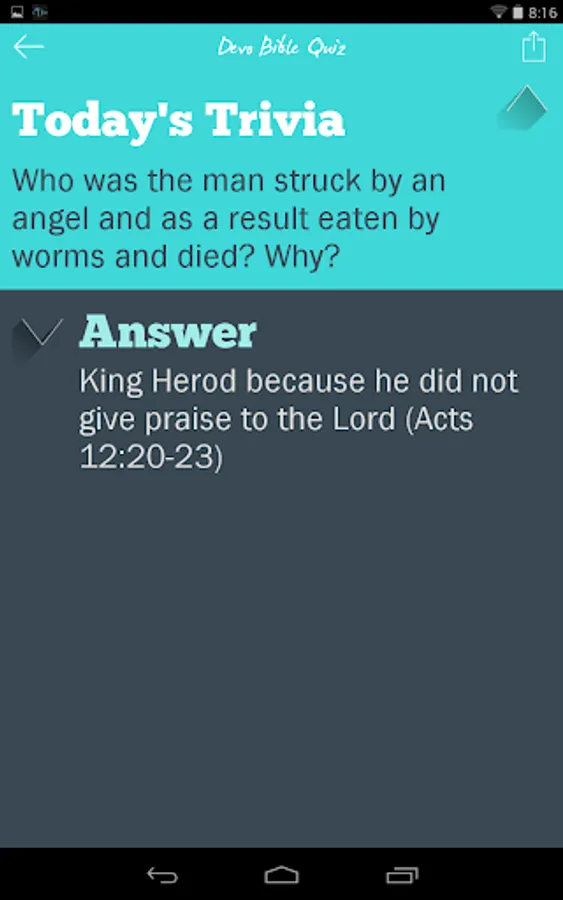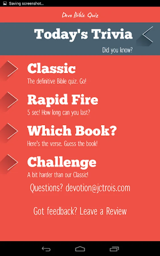 Four game modes and a bonus trivia question every day! Play and learn about people and events in the New Testament and Old Testament of the Bible. Many categories to choose from including a quick rapid fire game. Learn facts about Moses, Jesus, Noah, the disciples and many more.