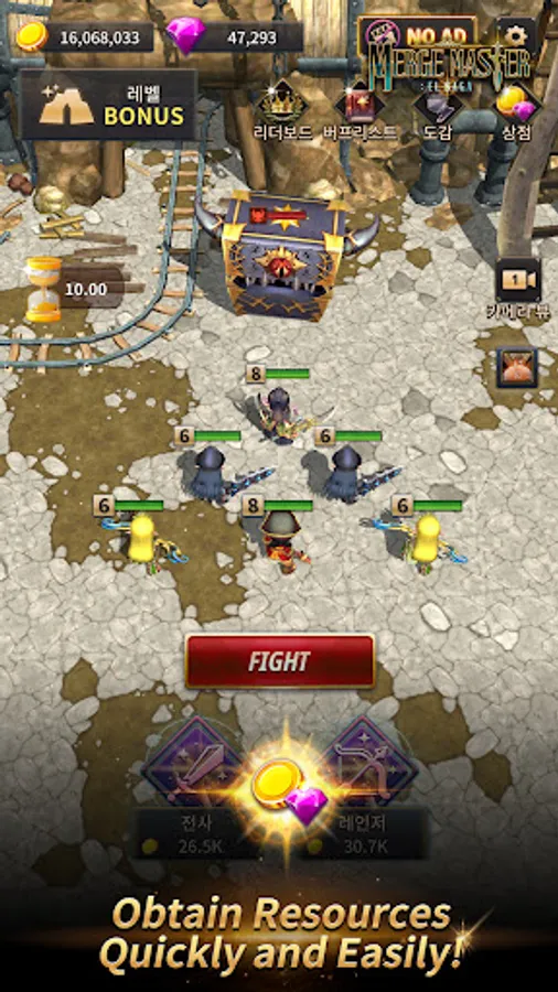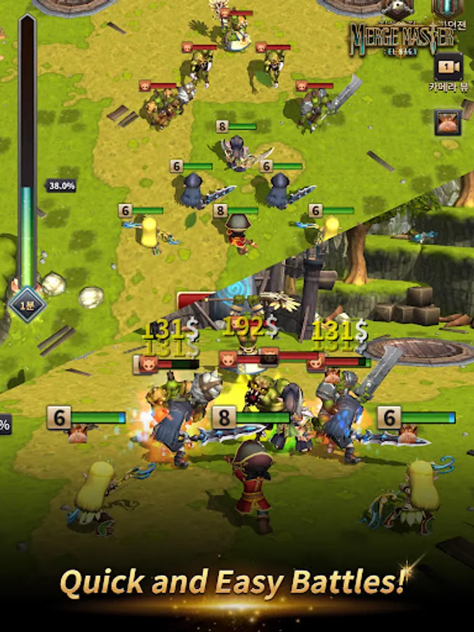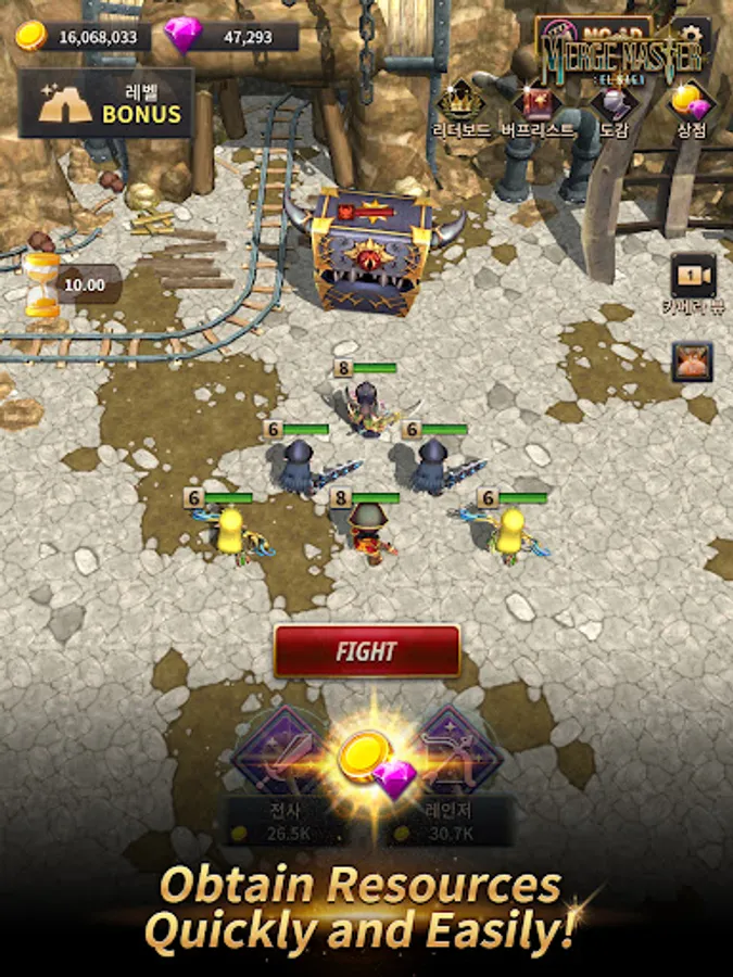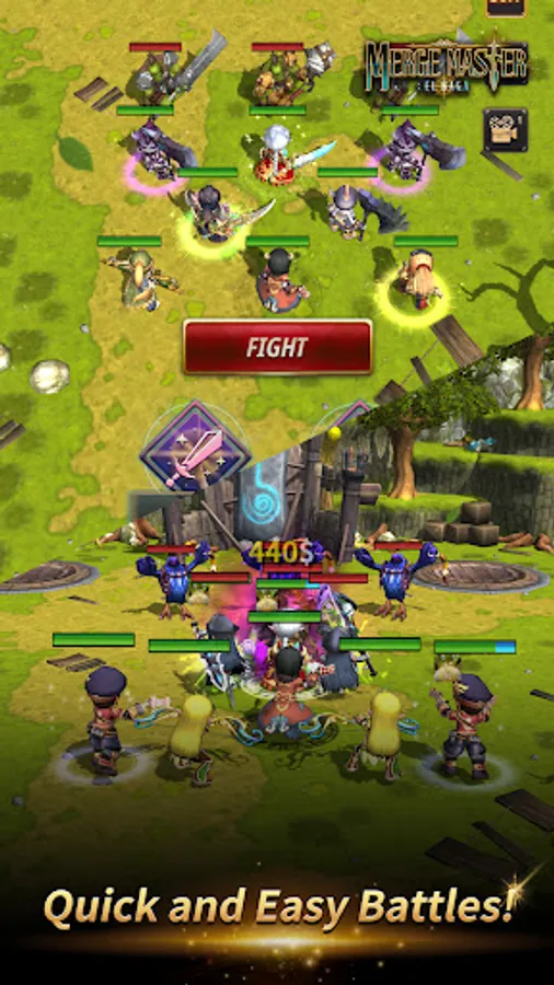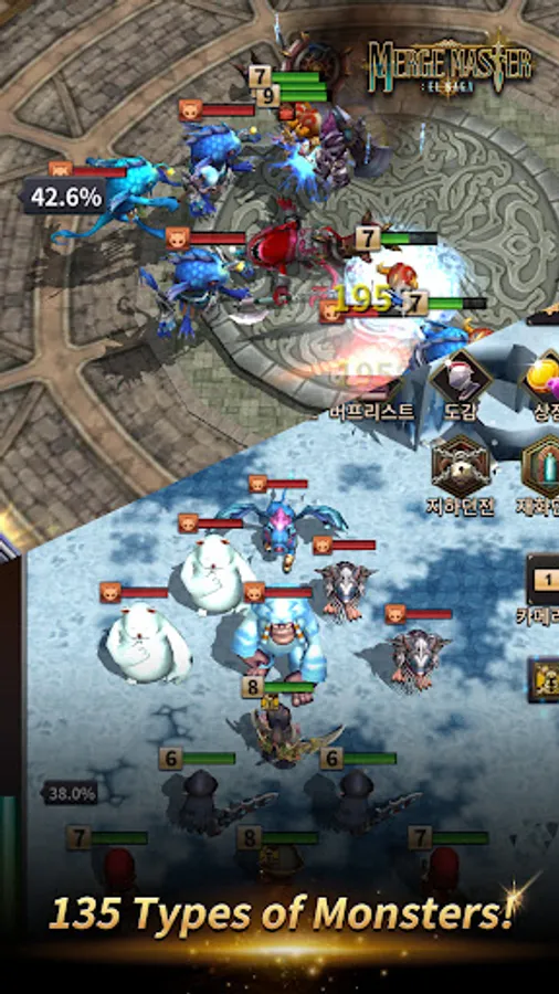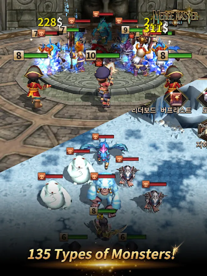 Merge characters and create stronger characters! Go to battle, defeat enemies, and clear stages!