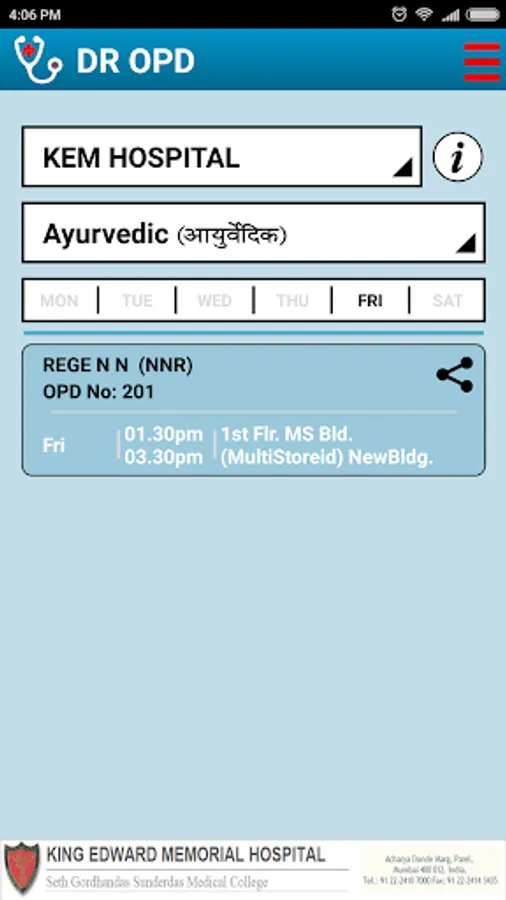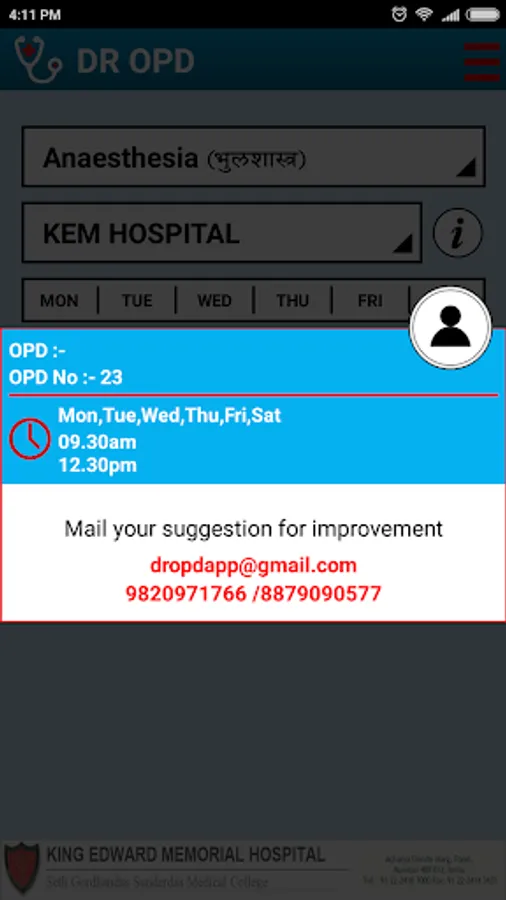 In this app we have mainly focus on OPD schedule of Public hospital (KEM) which is the 100 years old and well known hospital in India.