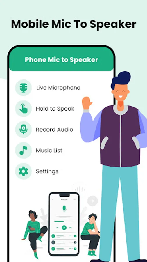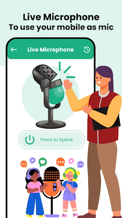 The Mobile Mic To Speaker app is perfect for anyone looking to use their phone as a microphone and connect it wirelessly to a Bluetooth speaker or karaoke microphone. This app allows you to speak loudly through a Bluetooth loudspeaker, making it ideal for announcements, singing, or amplifying your voice.
