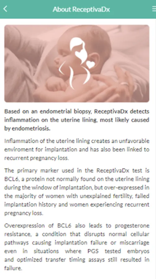 Provides information on ReceptivaDx testing for pregnancy loss, implantation failure and unexplained infertility. Info for both healthcare providers and women & families. Learn about the test, where and how to collect samples and helpful information to interpret results and understand treatment options.